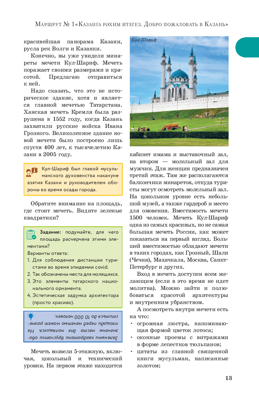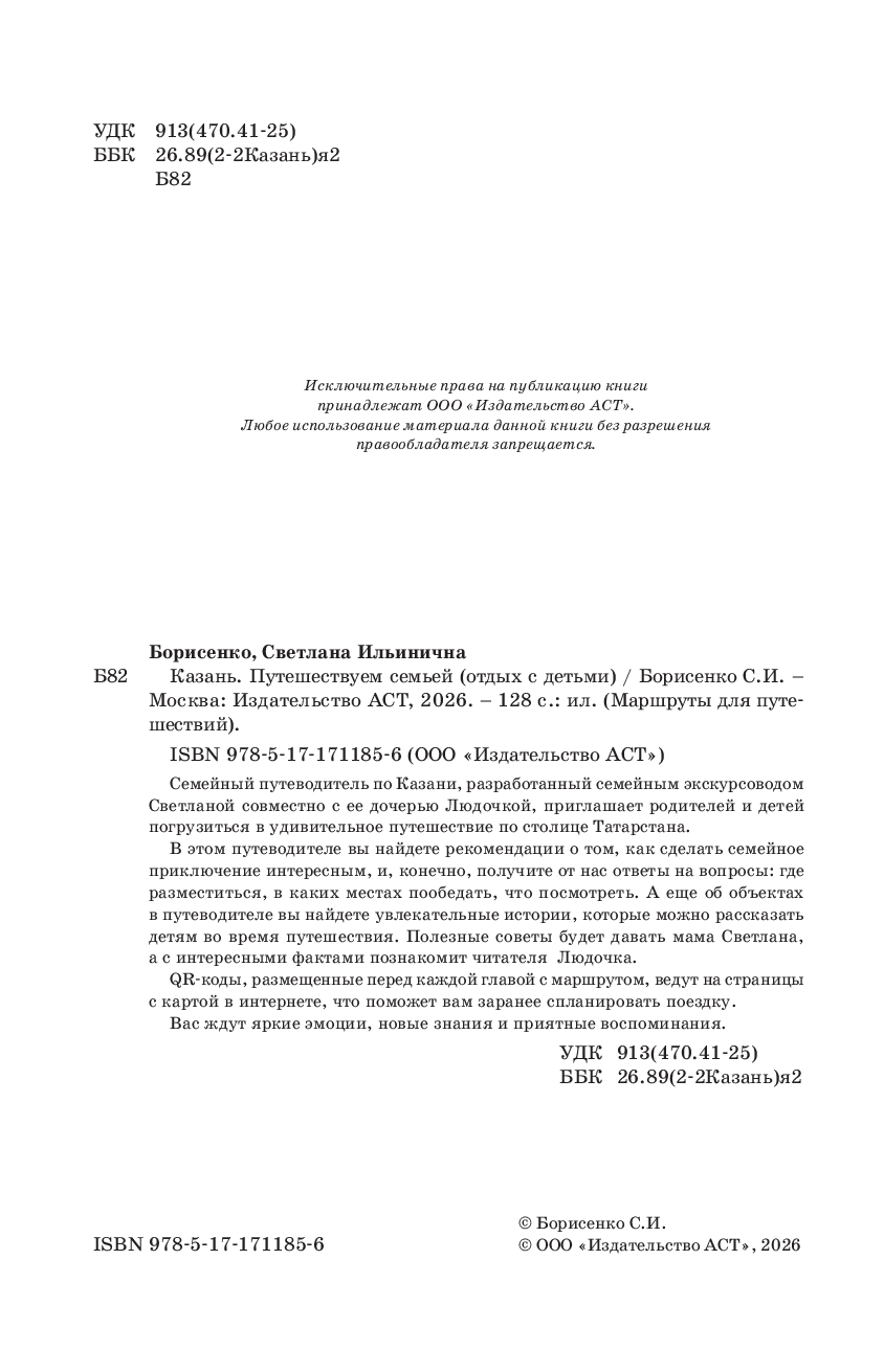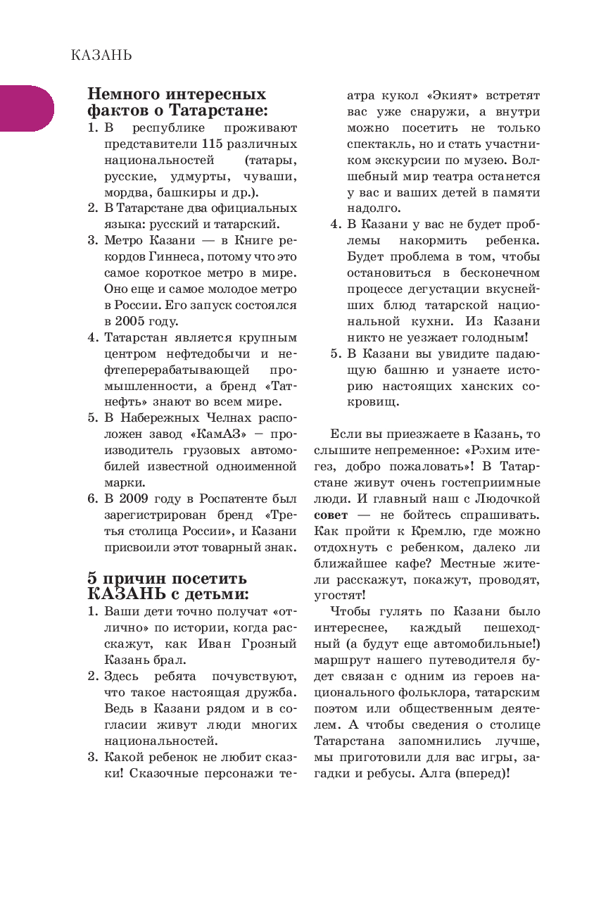 Семейный путеводитель по Казани, разработанный семейным экскурсоводом Светланой совместно с ее дочерью Людочкой, приглашает родителей и детей погрузиться в удивительное путешествие по столице Татарстана. В этом путеводителе вы найдете рекомендации о том, как сделать семейное приключение интересным, и, конечно, получите от нас ответы на вопросы: где разместиться, в каких местах пообедать, что посмотреть. А еще об объектах в путеводителе вы найдете увлекательные истории, которые можно рассказать детям во время путешествия. Полезные советы будет давать мама Светлана, а с интересными фактами познакомит читателя Людочка. QR-коды, размещенные перед каждой главой с маршрутом, ведут на страницы с картой в интернете, что поможет вам заранее спланировать поездку. Вас ждут яркие эмоции, новые знания и приятные воспоминания.
