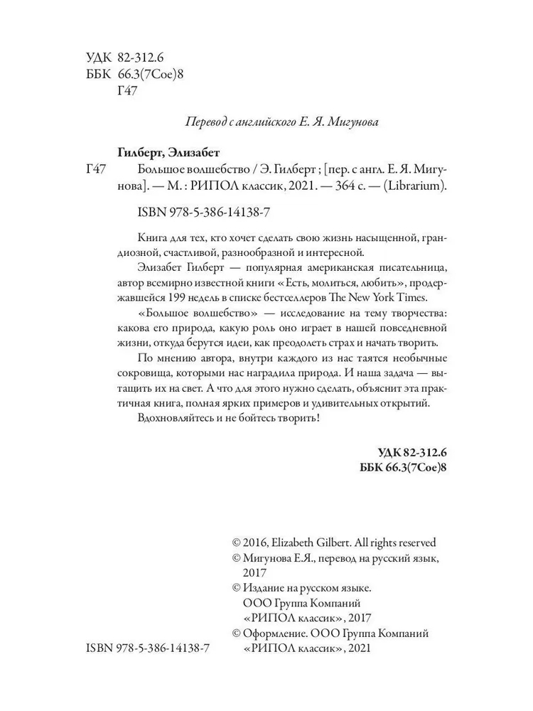 Книга для тех, кто хочет сделать свою жизнь насыщенной, грандиозной, счастливой, разнообразной и интересной. Элизабет Гилберт – популярная американская писательница, автор всемирно известной книги "Есть, молиться, любить", продержавшейся 199 недель в списке бестселлеров The New York Times. "Большое волшебство" – исследование на тему творчества: какова его природа, какую роль оно играет в нашей повседневной жизни, откуда берутся идеи, как преодолеть страх и начать творить. По мнению автора, внутри каждого из нас таятся необычные сокровища, которыми нас наградила природа. И наша задача – вытащить их на свет. А что для этого нужно сделать, объяснит эта практичная книга, полная ярких примеров и удивительных открытий. Вдохновляйтесь и не бойтесь творить!