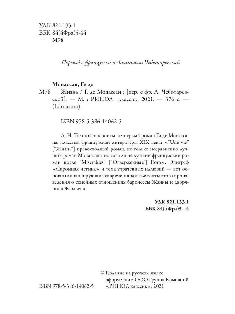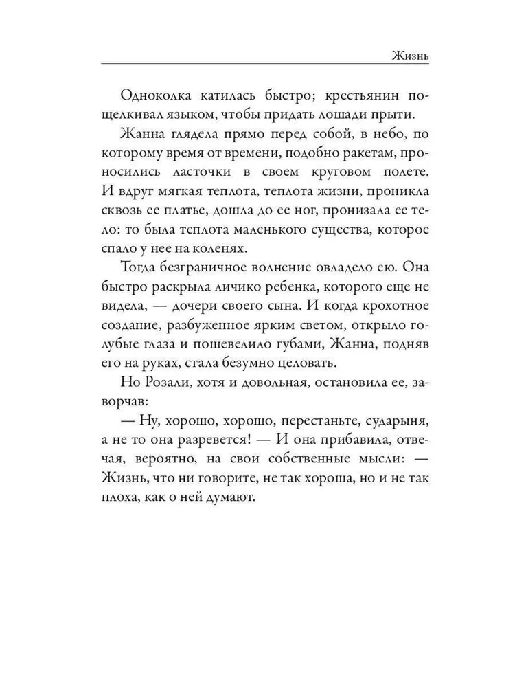Л. Н. Толстой так описывал первый роман Ги де Мопассана, классика французской литературы XIX века: "Une vie" превосходный роман, не только несравненно лучший роман Мопассана, но едва ли не лучший французский роман после "Miserables" Гюго".