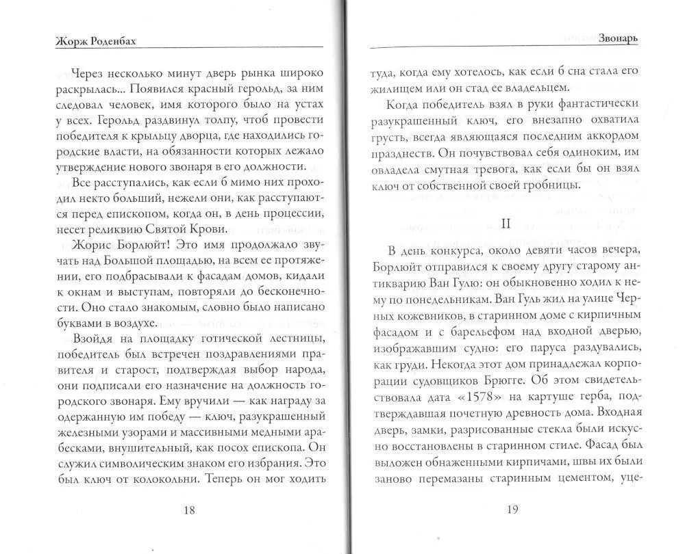 Жорж Роденбах (1855-1898) – выдающийся бельгийский поэт и романист, принадлежит вместе с Метерлинком к группе мистиков-символистов. Его называли "психологом городов". Это неслучайно, в романе "Звонарь" (1897) город Брюгге становится часовым механизмом, который с каждым боем колоколов отдается в жизни Жориса Борлюйта. Жорис посвятил жизнь музыке и этому городу. После смерти главного звонаря Брюгге Борлюйт становится его преемником. Однако счастлив ли Борлюйт, жил ли он? Только любовь, любовь запретная, трагичная, внезапная заставит его поверить в жизнь, вновь полюбить свой город. И отказаться от всего.