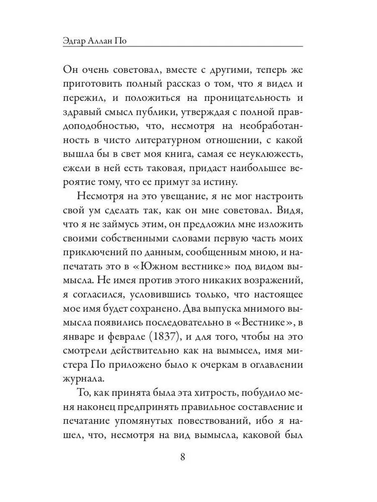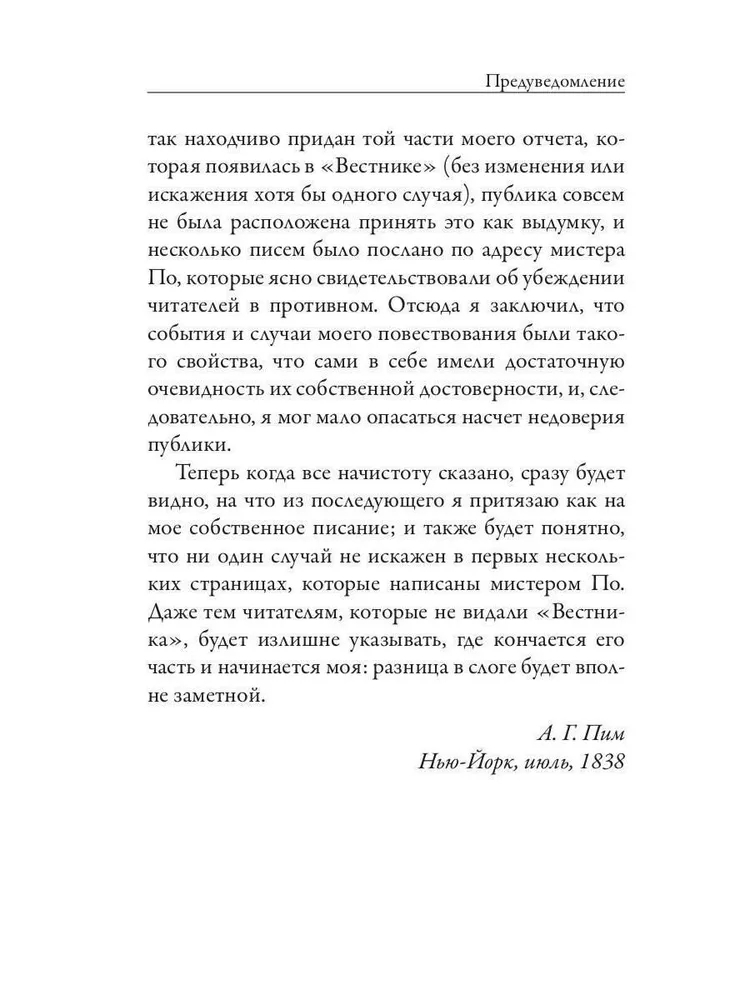 "Повествование Артура Гордона Пима из Нантакета" – захватывающий и потрясающий воображение роман. По стилистике он немного отличается от остального наследия Эдгара По. И тем не менее, читая его, понимаешь, что никто другой не смог бы написать подобное.