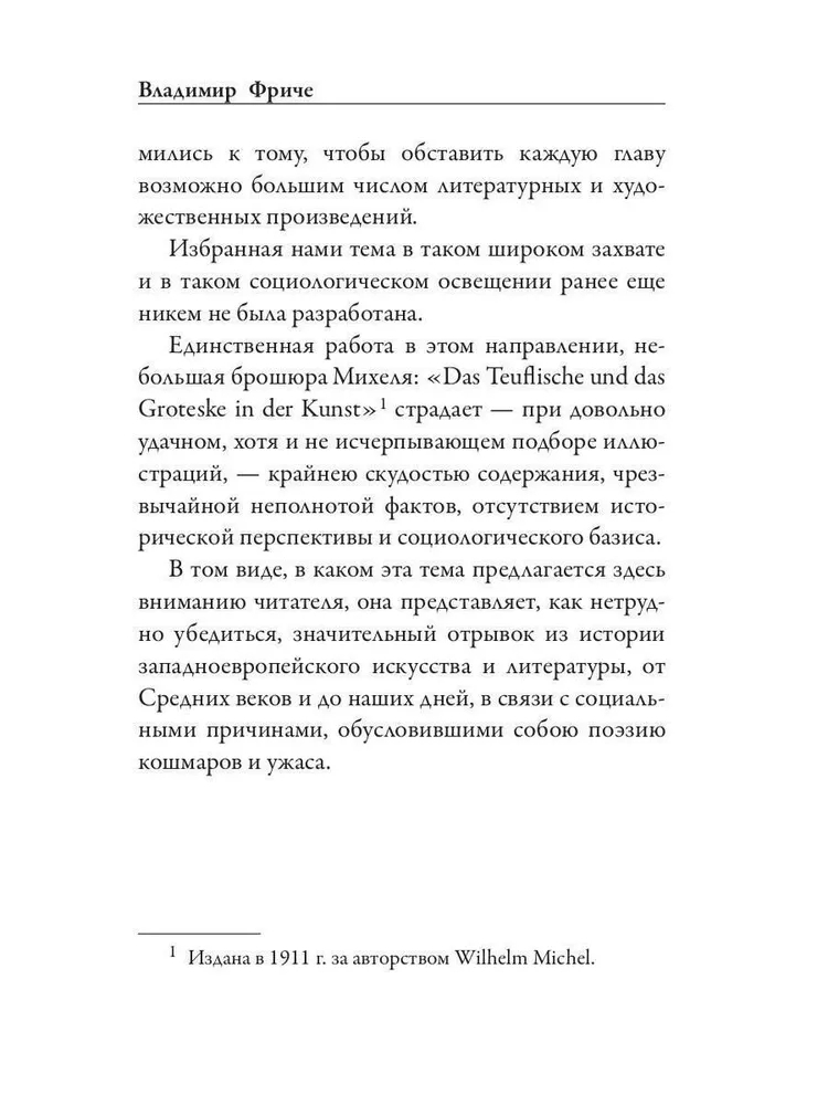 Владимир Максимович Фриче (1870-1929) – писатель, литературовед и искусствовед – исследует мир жутких кошмаров и безумия. В первую очередь через призму произведений искусства и литературы от эпохи Позднего Средневековья до начала ХХ века. У каждого столетия свой демон и свой ужас, Фриче называет их и рассказывает о том, как в очередной раз "над миром, над которым потухло солнце беззаботной радости, снова воцарился с рогами, увенчанными цветами, – князь тьмы". Автор не останавливается подробно на отдельных персоналиях той или иной эпохи, и это помогает увидеть всех жителей тех или иных поколений и их страхи.