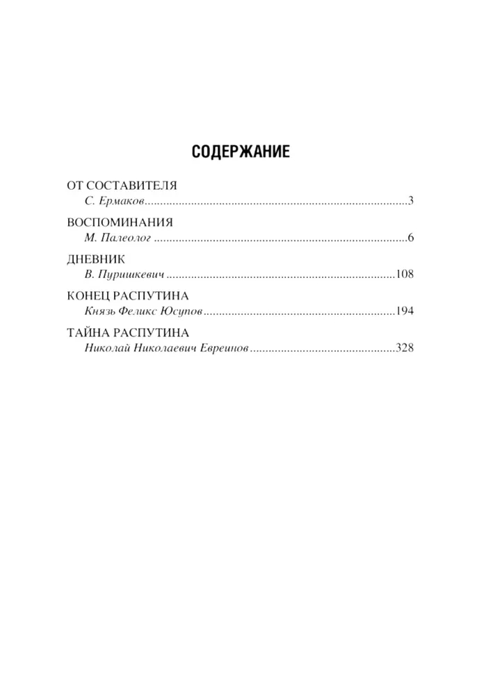 И некоторые детали жизни Распутина, и его гибель так до конца и не расследованы – и, возможно, останутся непроясненными навсегда. В этой книге под одной обложкой собраны несколько документов эпохи – мемуары участников и свидетелей событий и первые попытки их осмысления. Каждый документ – информация к размышлению, а выводы предстоит делать читателям.