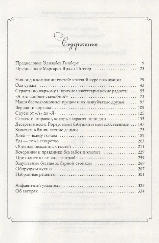 Книга Элизабет Гилберт и ее прабабушки Маргарет – не столько сборник рецептов, сколько путешествие во времени, переносящее читателя в Америку середины прошлого века, когда хозяйки пекли домашний хлеб, умели приготовить соус из каперсов по меньшей мере тремя способами и ждали к обеду десяток гостей. А обед всегда был прекрасным поводом устроить маленький праздник, чтобы поделиться с друзьями душевным теплом и радостью бытия.