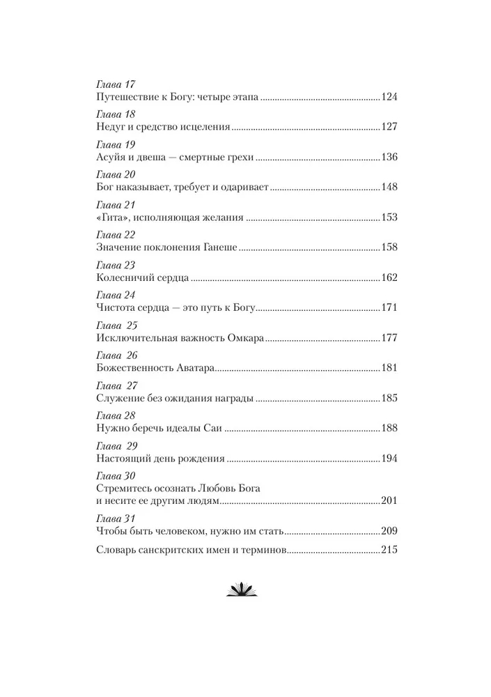 В этом томе вдохновенных бесед духовного учителя и чудотворца, Бхагавана Шри Сатья Саи Бабы, вы сможете раскрыть для себя тайны Бытия, и, возможно, прийти к понимаю того, каким путем должен следовать человек, чтобы обрести мир в душе, пребывать в гармонии и быть единым с Богом. Какие бы священные писания человек не изучал, какими бы духовными практиками не занимался, пока ему не удастся очистить сердце, жизнь его будет пустой и бессмысленной. Исходя из примеров нашей повседневной жизни, а также проводя параллели с прошлым, Саи Баба дает советы и наставления, как следовать истинному пути и жить счастливой, полноценной жизнью.
