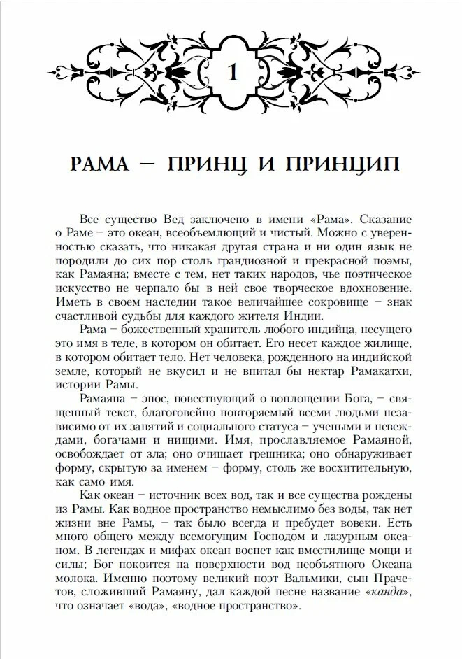 Перед вами древнее ведическое сказание Рамаяна. Это не рассказ об отдельной личности. Это история самой Вселенной. Бог осуществляет всемирный принцип, объединяющий все сущее. Он заполняет собой пространство и время. Эта история – не летопись прошлых дней: в ней заключены настоящее и будущее, она охватывает всю бесконечность времени, не имеющую ни конца, ни начала. Никакой муравей не укусит вас, не будь на то Воля Бога! Ни один лист не сорвется с ветки без его желания! Рама – это принцип, который притягивает друг к другу враждебные и несовместимые элементы природы, сообщая им гармонию и любовь. Эта пленительная сила притяжения, побуждающая к взаимодействию, лежит в основе существования и процессов, происходящих во Вселенной.