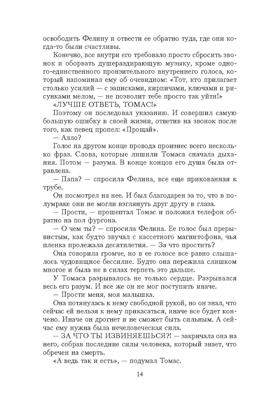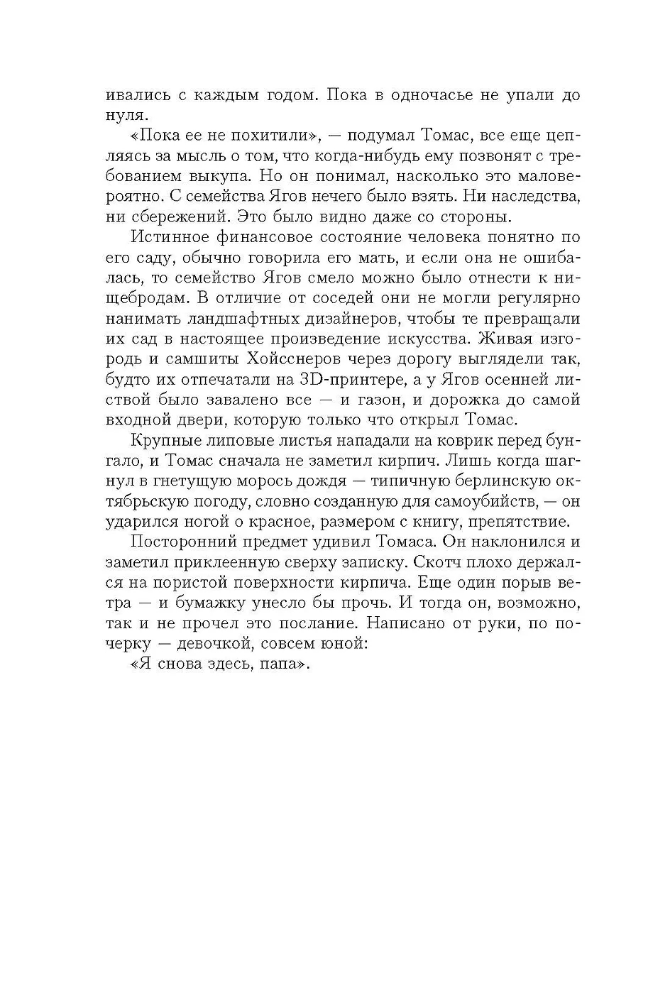 Месяц назад пятнадцатилетняя Фелина Ягов бесследно исчезла по пути в школу. Нанятый ее матерью частный детектив Александер Цорбах наткнулся на музыкальный сервис в Интернете, через который Фелина всегда слушала свои любимые песни. Удивительное дело: всего несколько дней назад плейлист был изменен. Не посылает ли Фелина с помощью выбранных треков тайный сигнал о том, где она находится и как ее можно спасти? Цорбах лихорадочно пытается расшифровать загадку плейлиста, не подозревая, что поиски Фелины и разгадка музыкальной головоломки обернутся для него настоящим кошмаром. Впереди безжалостная гонка со временем, где шансы на выживание всех участников стремятся к нулю.