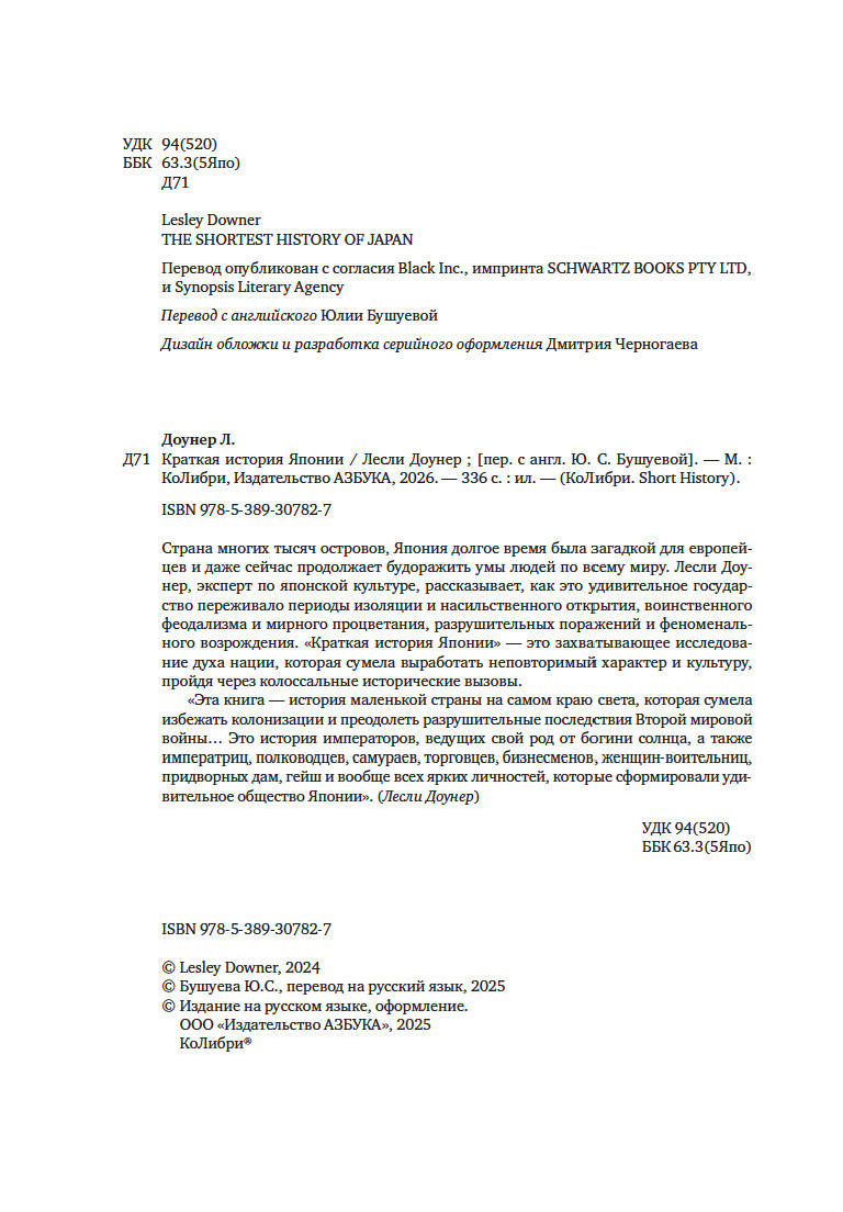 Страна многих тысяч островов, Япония долгое время была загадкой для европейцев и даже сейчас продолжает будоражить умы людей по всему миру. Лесли Доунер, эксперт по японской культуре, рассказывает, как это удивительное государство переживало периоды изоляции и насильственного открытия, воинственного феодализма и мирного процветания, разрушительных поражений и феноменального возрождения. «Краткая история Японии» – это захватывающее исследование духа нации, которая сумела выработать неповторимый характер и культуру, пройдя через колоссальные исторические вызовы.