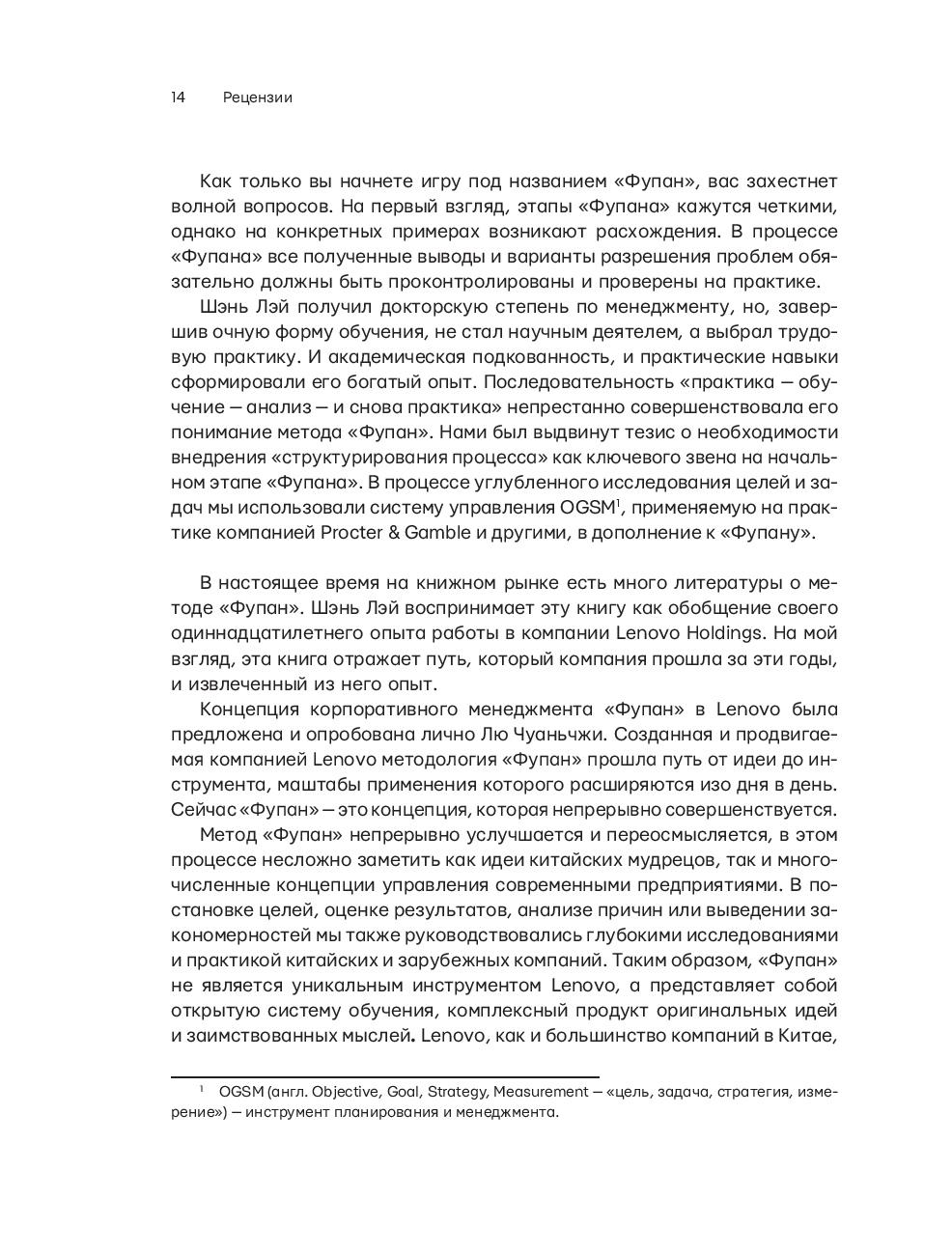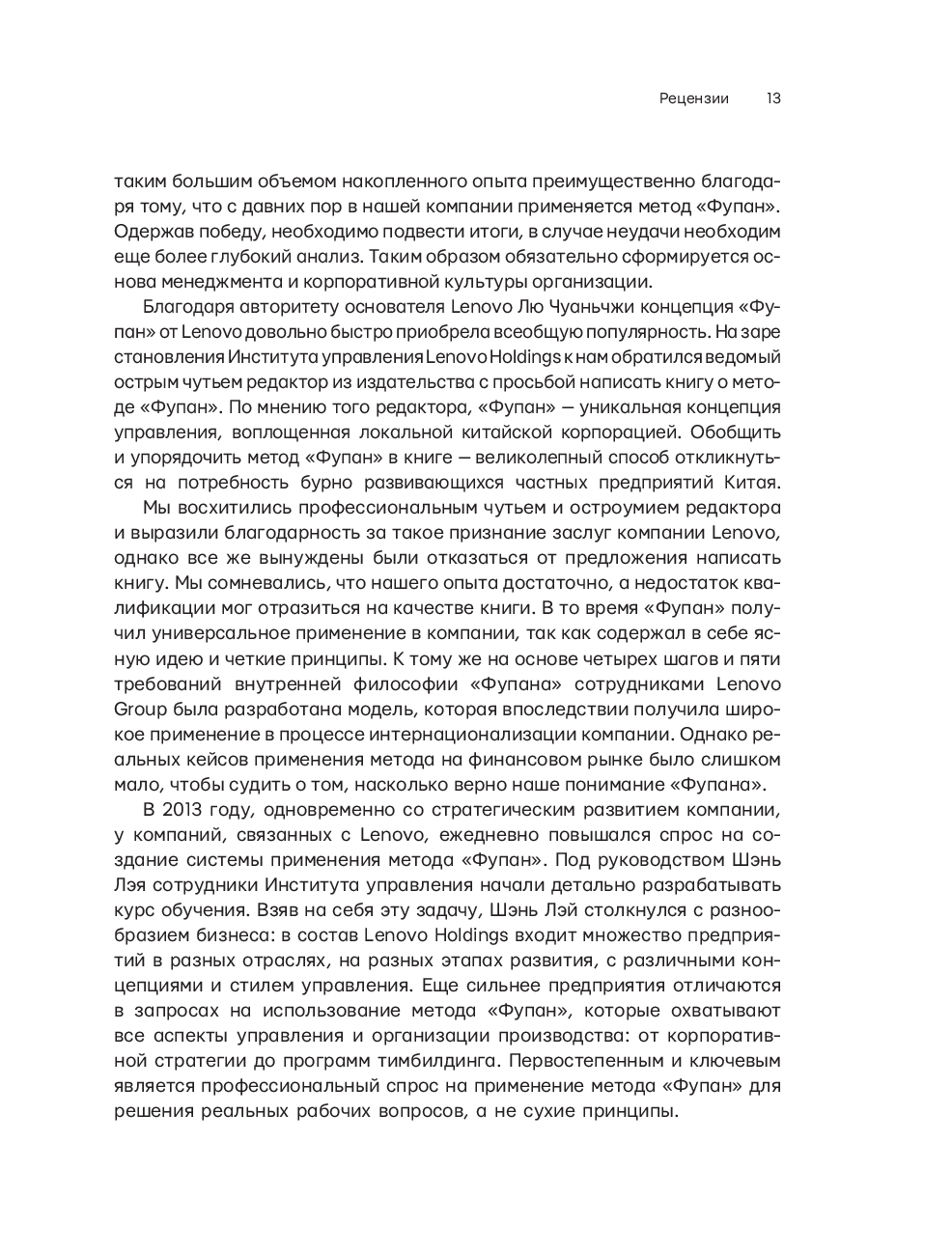В чем же секрет впечатляющего успеха Lenovo Group? Для того чтобы балансировать между скоростью и качеством и достигать поставленных целей, компания разработала и внедрила метод групповой оценки "Фупан". Он позволяет сотрудникам оценивать работу компании, анализировать причины ее успеха и неудач и вносить коррективы. Lenovo Group успешно интегрировала метод "Фупан" в систему управления компанией и последовательно применяет его на практике. В 2011 году метод вырос за рамки компании и начал распространяться по миру, помогая командам повышать качество работы без ущерба для скорости.