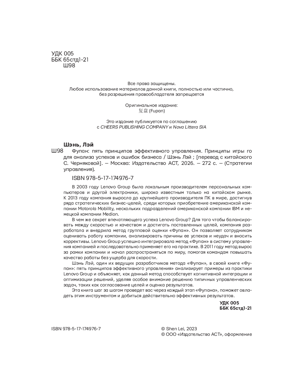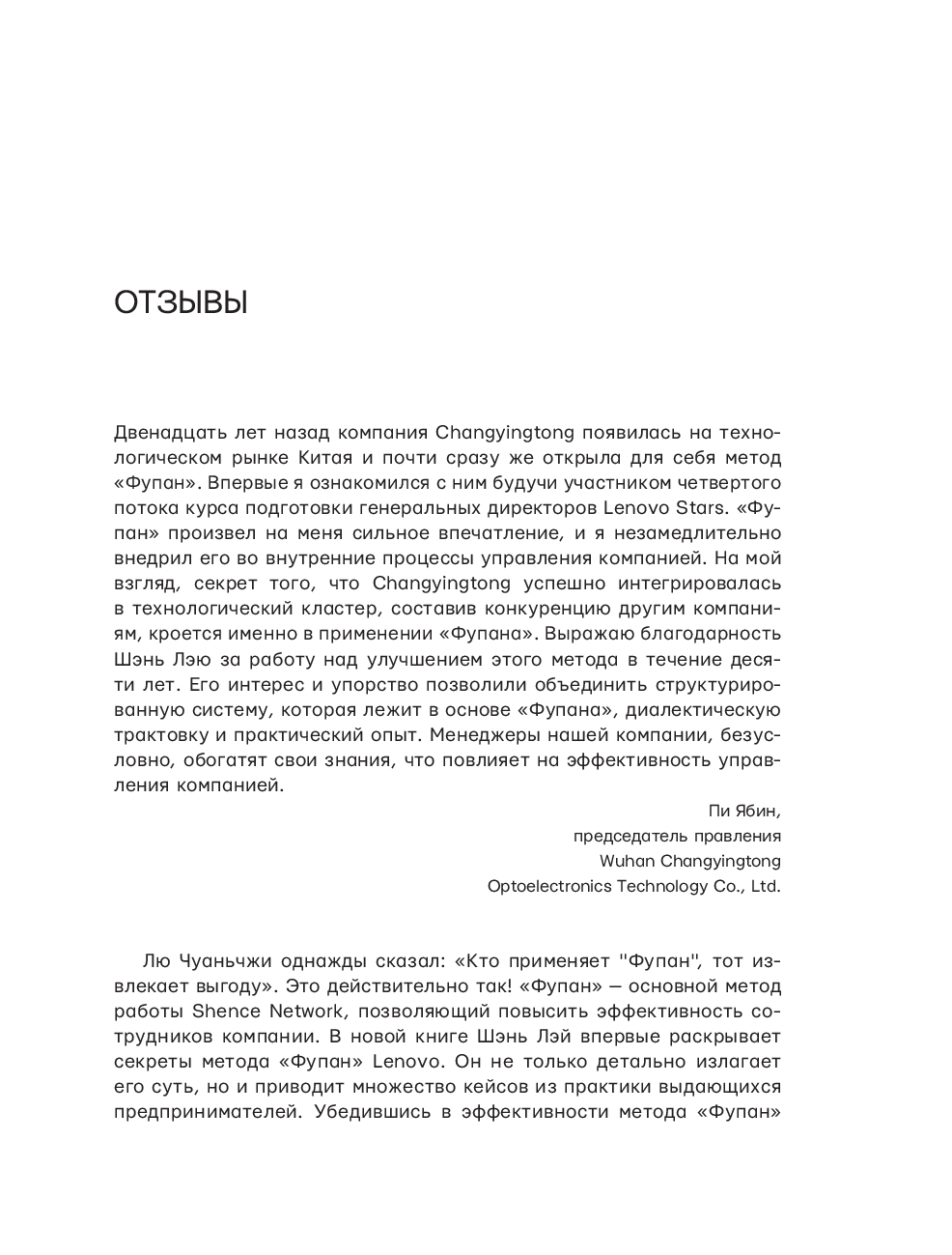 Шэнь Лэй, один их ведущих разработчиков метода "Фупан", в своей книге "Фупан: пять принципов эффективного управления" анализирует примеры из практики Lenovo Group и объясняет, как данный метод способствует когнитивной интеграции и оптимизации решений, уделяя особое внимание решению типичных управленческих задач, таких как согласование целей и оценка результатов.