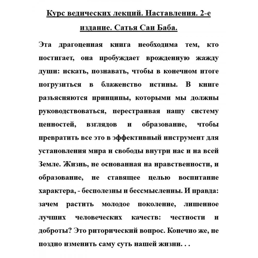 В книге разъясняются принципы, которыми мы должны руководствоваться, перестраивая нашу систему ценностей, взглядов и образование, чтобы превратить все это в эффективный инструмент для установления мира и свободы внутри нас и на всей Земле. Жизнь, не основанная на нравственности, и образование, не ставящее целью воспитание характера, – бесполезны и бессмысленны. И правда: зачем растить молодое поколение, лишенное лучших человеческих качеств: честности и доброты? Это риторический вопрос. Конечно же, не поздно изменить саму суть нашей жизни.