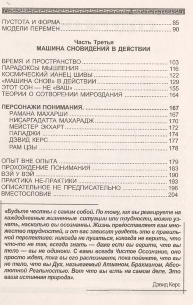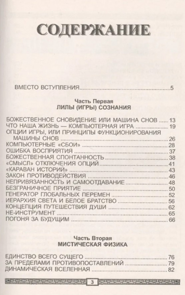 Никто не задумывается, что "живет" в тотальном сне, произведенном некой машиной сновидений. Эта всесильная машина (человеческий ум) непрерывно фабрикует невероятное количество историй- снов, из потока которых мы что-то выхватываем, присваиваем и называем "собой" и "своей " жизнью. Тем не менее, этот непрекращающийся поток сновидений то тут, то там демонстрирует их разрозненность и иллюзорность. Такие "бреши" в сновидении или "компьютерные сбои" ( все аномальные происшествия и чудеса ) мы старательно не замечаем, но " правильный", разоблачительный взгляд на них может стать ключом к Пониманию, фактором, разрушающим целостность иллюзии.