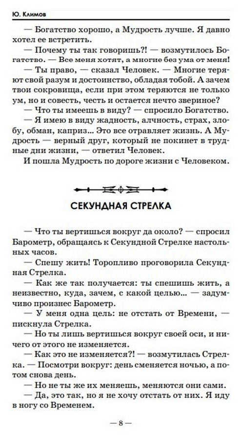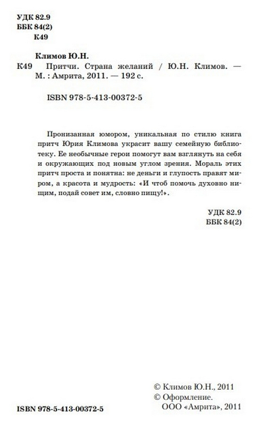 Пронизанная юмором, уникальная по стилю книга притч Юрия Климова украсит вашу семейную библиотеку. Ее необычные герои помогут вам взглянуть на себя и окружающих под новым углом зрения. Мораль этих притч проста и понятна: не деньги и глупость правят миром, а красота и мудрость: "И чтоб помочь духовно нищим, подай совет им, словно пищу! "