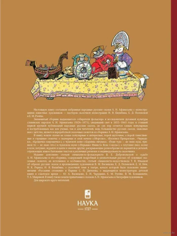 Настоящую книгу составили избранные народные русские сказки А. Н. Афанасьева с иллюстрациями известных художников – мастеров сказочной иллюстрации И. Я. Билибина, Е. Д. Поленовой и Е. М. Рачёва. Знаменитый сборник выдающегося собирателя фольклора и исследователя духовной культуры славянских народов А. Н. Афанасьева (1826–1871), увидевший свет в 1855–1863 годах и ставший первой научной публикацией народных русских сказок, до сих пор остается самым популярным и востребованным как для ученых, так и для читателей, ведь большинство русских сказок, знакомых нам с детства, является переработкой сказочных сюжетов из сборника А. Н. Афанасьева.