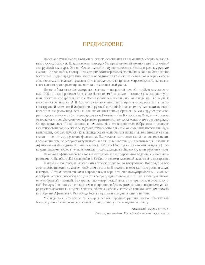 Издание дополнено статьей специалиста-фольклориста В. Е. Добровольской о судьбе А. Н. Афанасьева и его сборника, содержащей подробный и увлекательный рассказ об основных сказочных сюжетах, их источниках и особенностях, статьей специалиста-искусствоведа Т. В. Ильиной об образах русских сказок в произведениях художников В. М. Васнецова, Е. Д. Поленовой, Е. М. Бём, Н. К. Рериха, И. Я. Билибина, о сказочной теме в театре, начало которой было положено знаменитыми "Русскими сезонами" в Париже С. П. Дягилева, о выдающихся иллюстраторах детской книги в советское время – Ю. А. Васнецове, Е. И. Чарушине, Е. М. Рачёве, В. М. Конашевиче, Т. А. Мавриной. В книгу также вошли примечания к сказкам А. Н. Афанасьева и биографии художников.