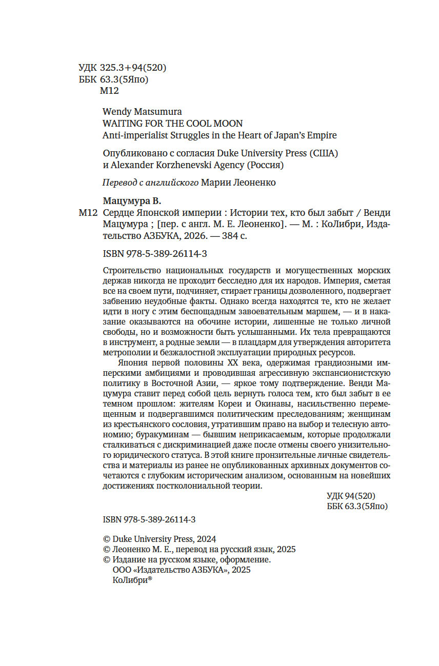 Япония первой половины XX века, одержимая грандиозными имперскими амбициями и проводившая агрессивную экспансионистскую политику в Восточной Азии, – яркое тому подтверждение. Венди Мацумура ставит перед собой цель вернуть голоса тем, кто был забыт в ее темном прошлом: жителям Кореи и Окинавы, насильственно перемещенным и подвергавшимся политическим преследованиям; женщинам из крестьянского сословия, утратившим право на выбор и телесную автономию; буракуминам – бывшим неприкасаемым, которые продолжали сталкиваться с дискриминацией даже после отмены своего унизительного юридического статуса. В этой книге пронзительные личные свидетельства и материалы из ранее не опубликованных архивных документов сочетаются с глубоким историческим анализом, основанным на новейших достижениях постколониальной теории.