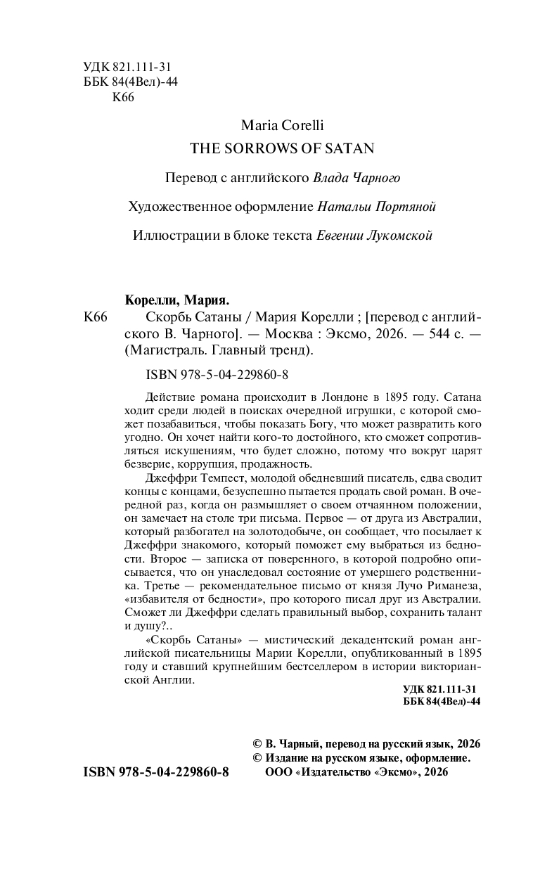 "Скорбь Сатаны" – мистический декадентский роман английской писательницы Марии Корелли, опубликованный в 1895 году и ставший крупнейшим бестселлером в истории викторианской Англии.
