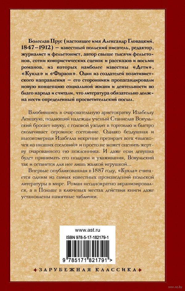 Впервые опубликованная в 1887 году, "Кукла" считается одним из самых известных произведений польской литературы в мире. Роман неоднократно экранизировался, а в Польше в ключевых местах действия книги даже установлены памятные таблички.