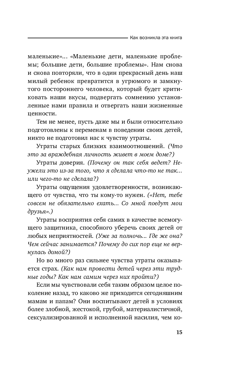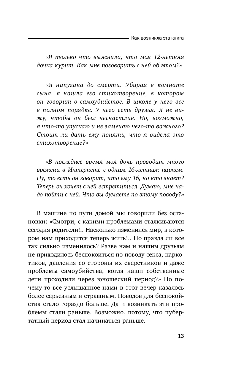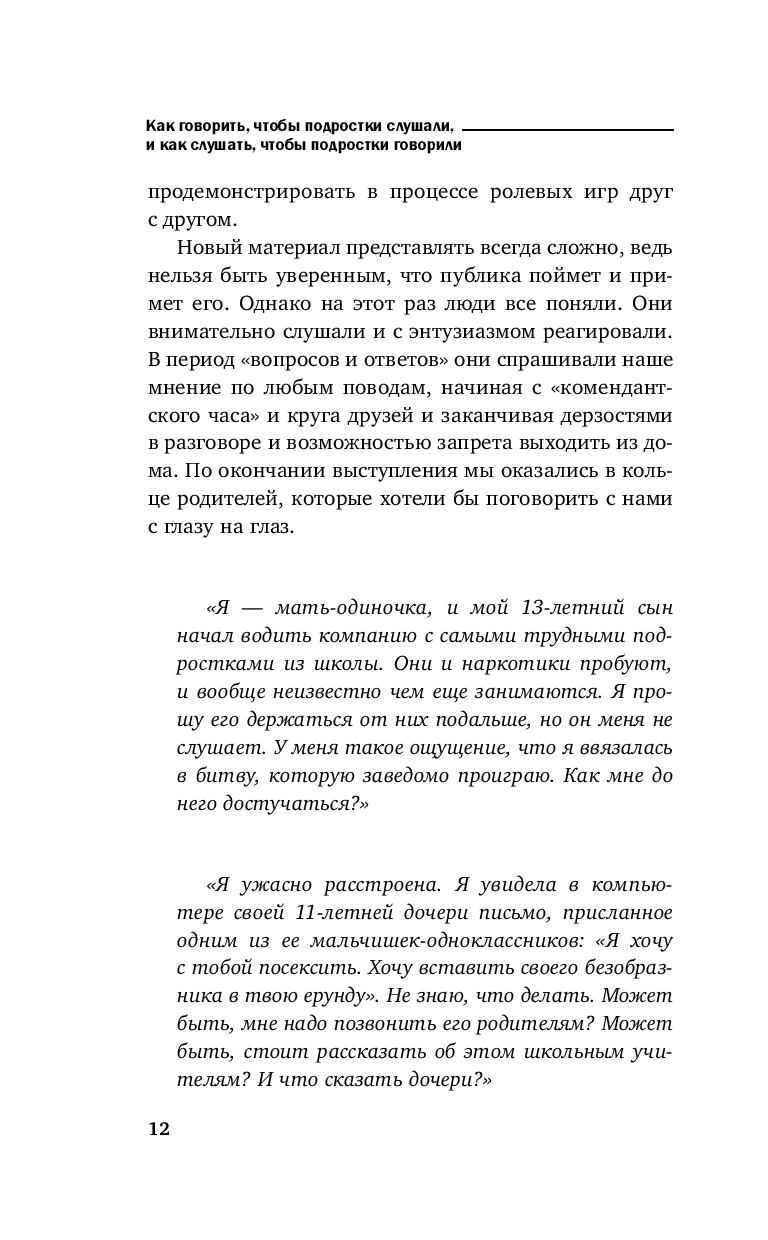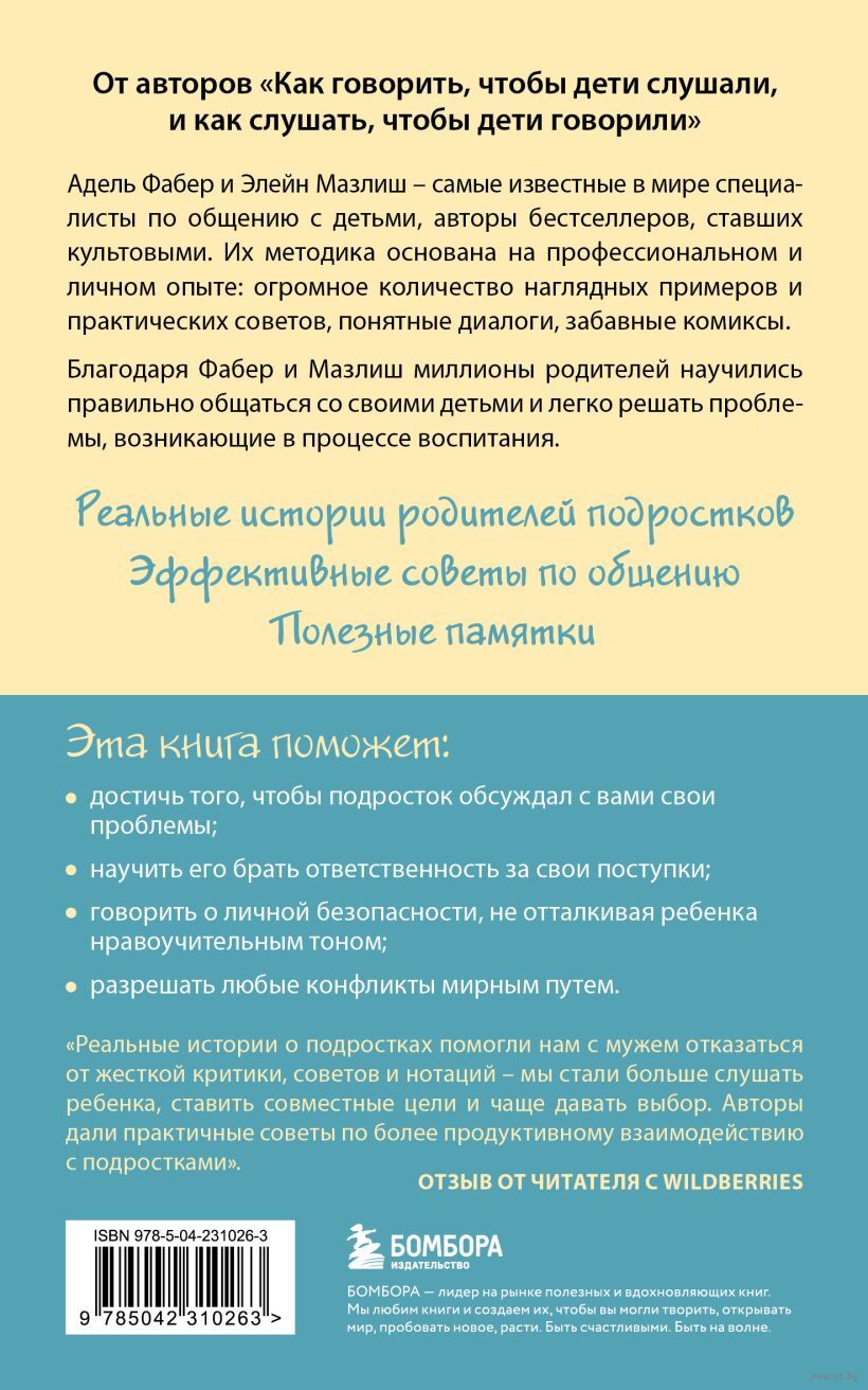 После невероятного успеха книги "Как говорить, чтобы дети слушали, и как слушать, чтобы дети говорили" обеспокоенные родители и учителя из разных стран стали присылать письма А. Фабер и Э. Мазлиш с просьбой написать аналогичную книгу про общение с подростками.