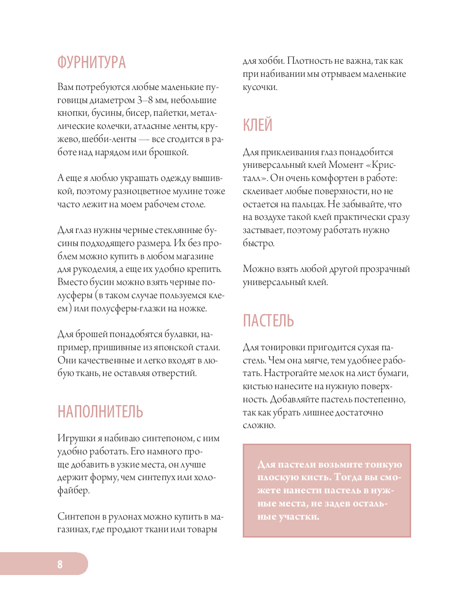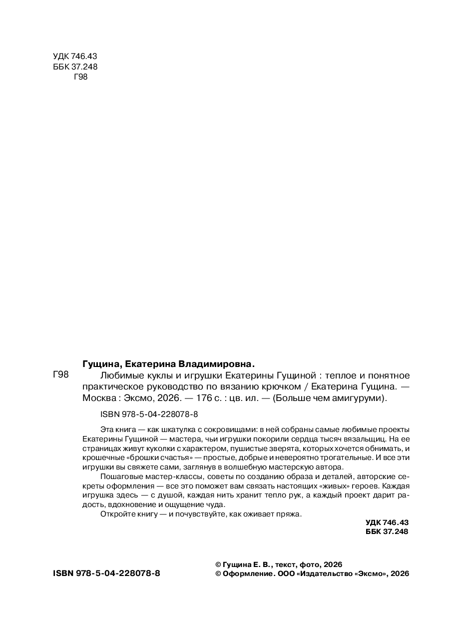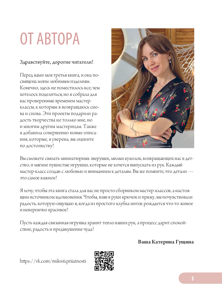Эта книга – как шкатулка с сокровищами: в ней собраны самые любимые проекты Екатерины Гущиной – мастера, чьи игрушки покорили сердца тысяч вязальщиц. На ее страницах живут куколки с характером, пушистые зверята, которых хочется обнимать, и крошечные "брошки-счастья" – простые, добрые и невероятно трогательные. И все эти игрушки вы свяжете сами, заглянув в волшебную мастерскую автора.