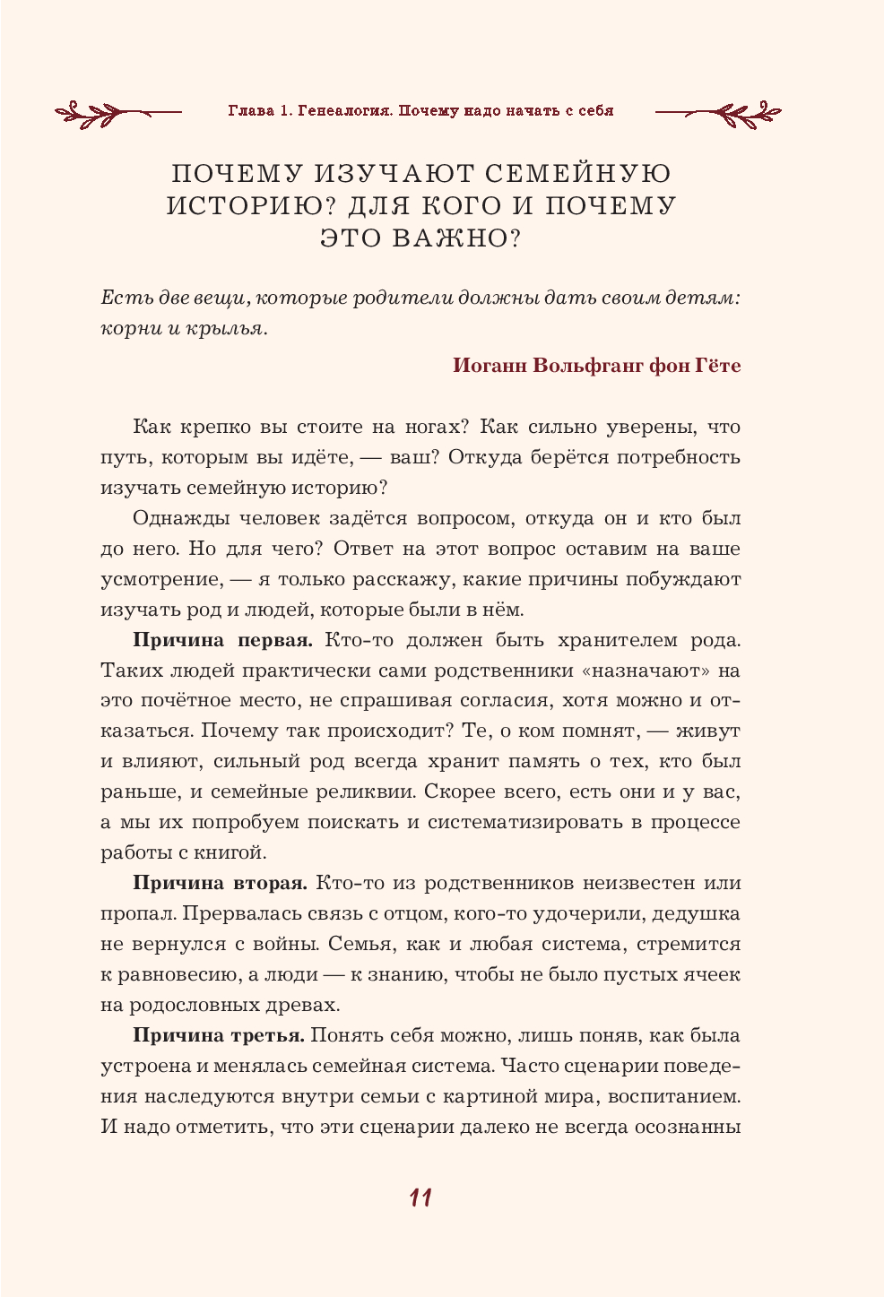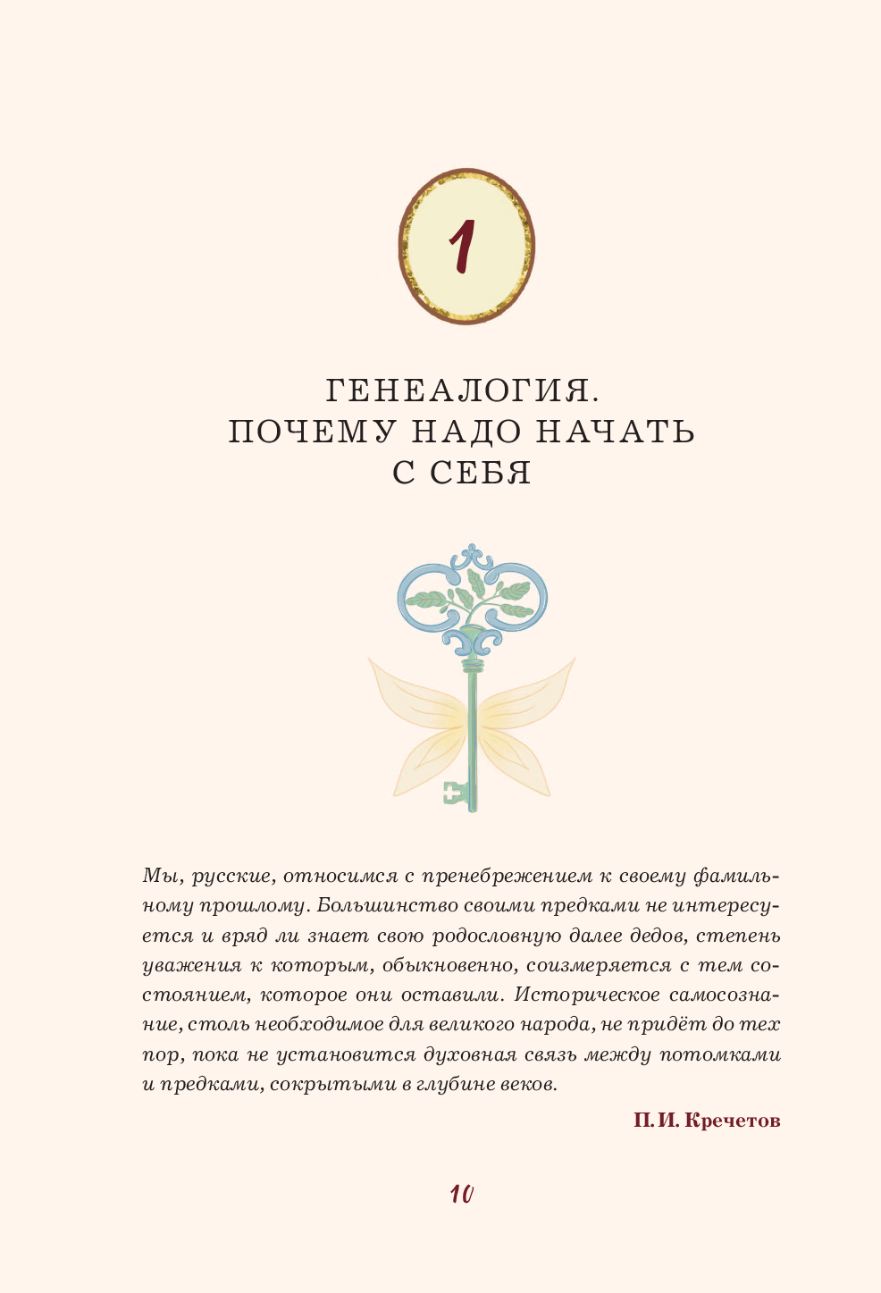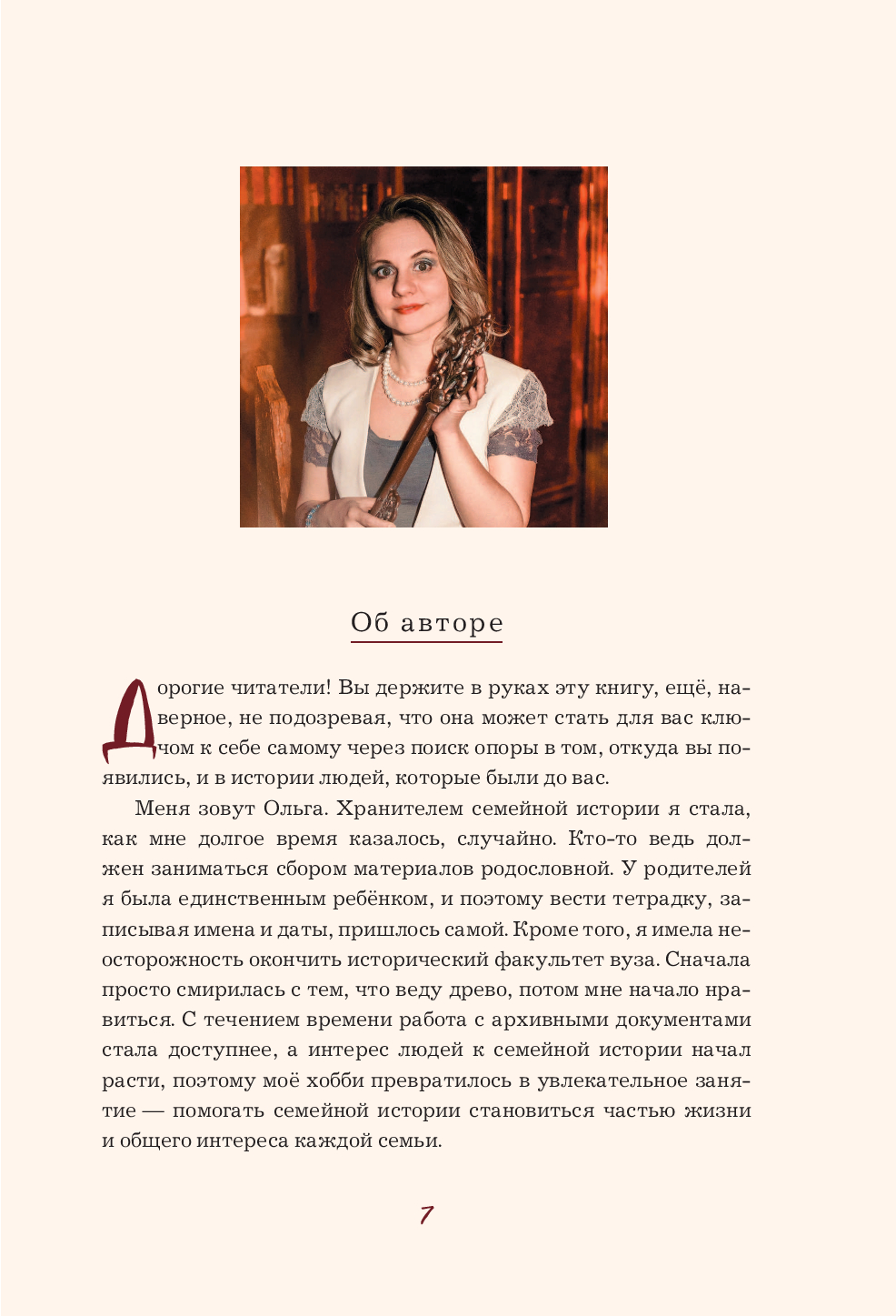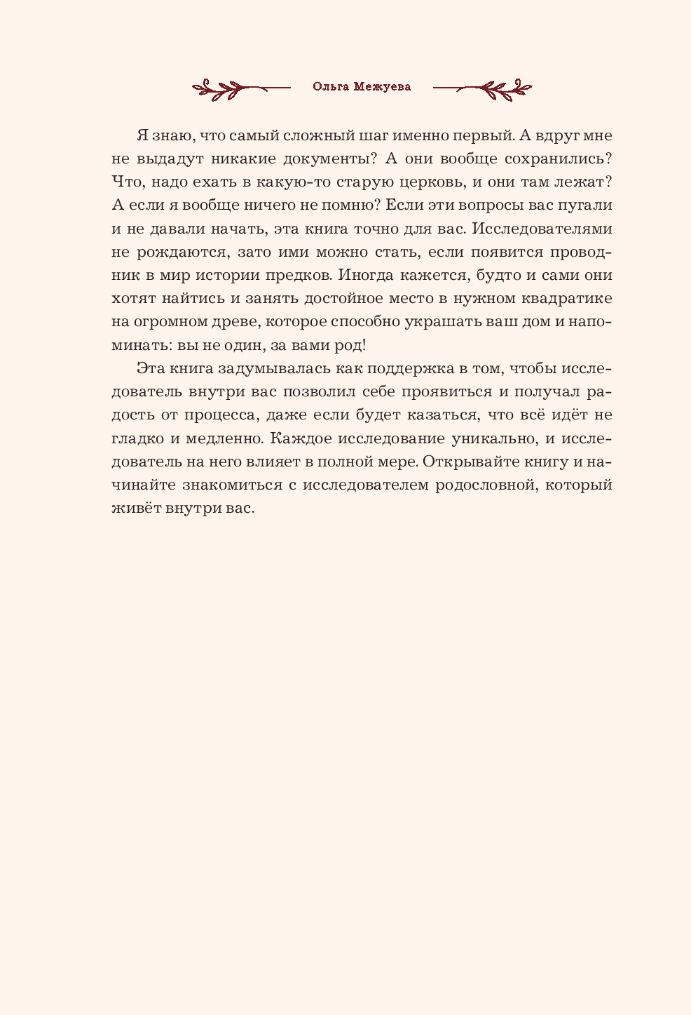 Эта книга – путеводитель по семейной истории. Она поможет каждому стать Хранителем своего рода: от первых воспоминаний и домашних реликвий до работы с архивами, интервью с родственниками и генеалогических поездок. Историк и генеалог Ольга Межуева делится личным опытом, даёт поэтапные инструкции, чек-листы и практики для самопознания, чтобы даже начинающий исследователь мог шаг за шагом собрать своё семейное древо.