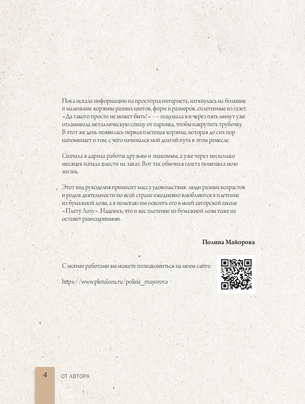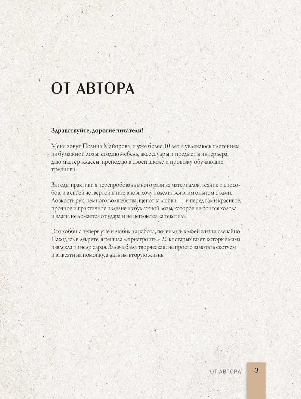 Уникальное руководство по плетению из бумажной лозы от опытного мастера Полины Майоровой! В книге – 11 проектов: сумочка, корзины, домик для питомца и многое другое. Плетение – это не только красивые изделия, но и способ снять стресс, замедлиться и наполнить дом уютом. Полина объясняет всё просто и понятно, помогает избежать ошибок и насладиться процессом. Это новое хобби мягко вплетется в вашу жизнь уже после первого мастер-класса!