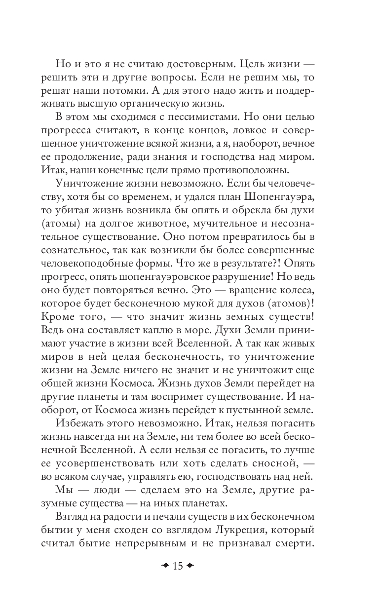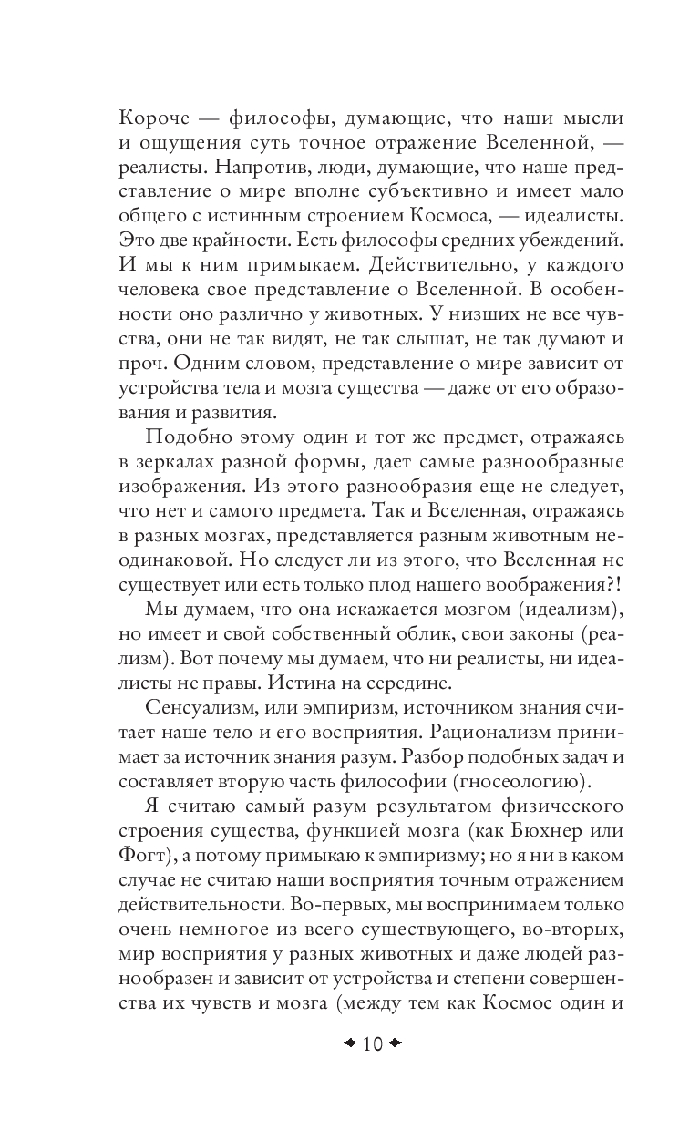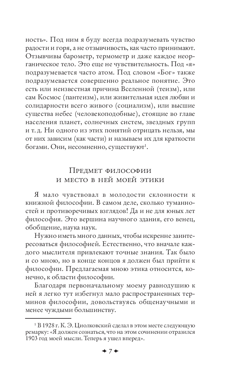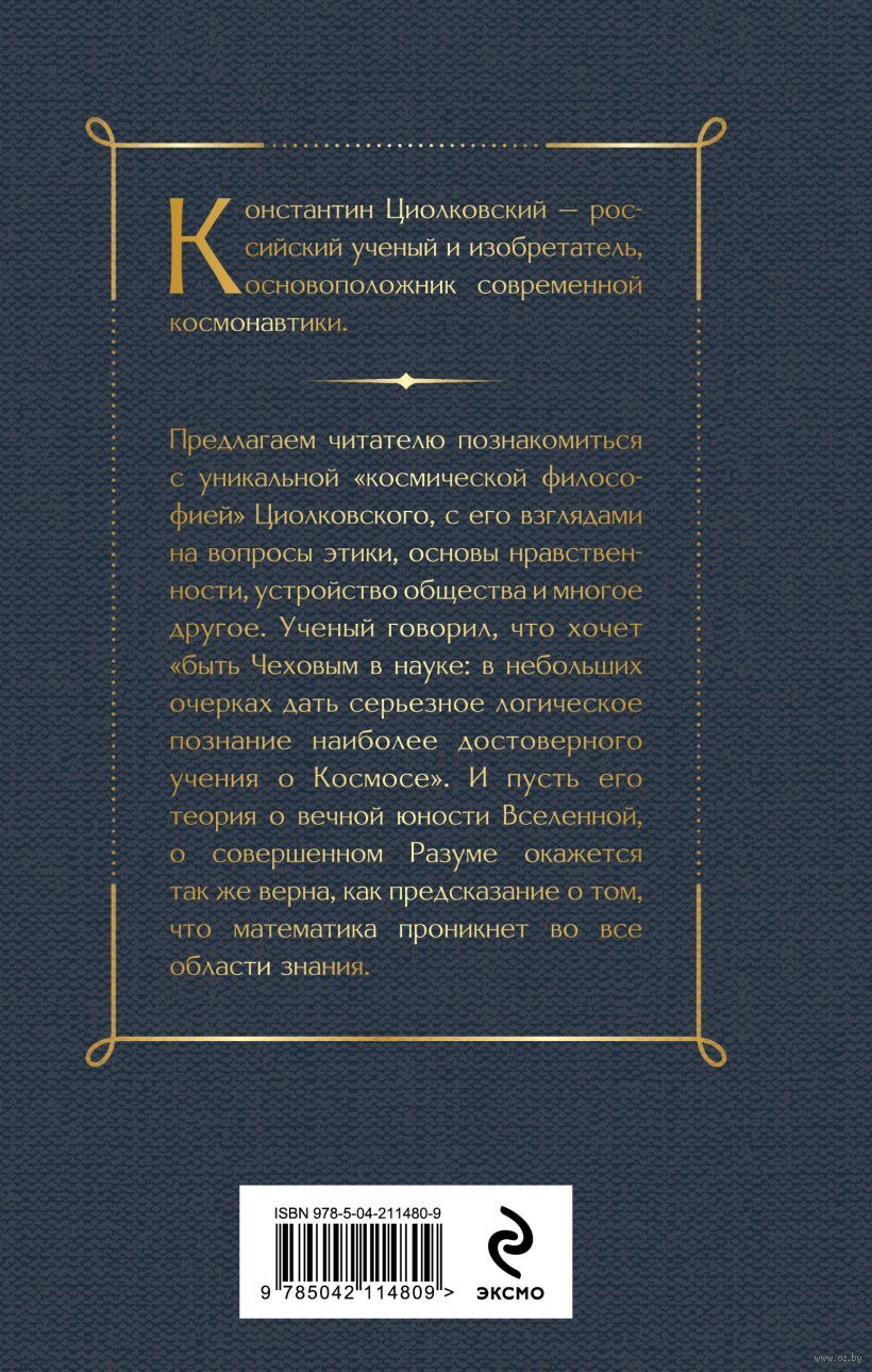 Предлагаем читателю познакомиться с "космической философией" Константина Циолковского, с его взглядами на вопросы этики, основы нравственности, устройство общества и многое другое. "... хочу быть Чеховым в науке: в небольших очерках дать серьезное логическое познание наиболее достоверного учения о Космосе". И пусть его теория о вечной юности Вселенной, о совершенном Разуме окажется так же верна, как предсказание о том, что "...математика проникнет во все области знания", как работает сегодня разработанный именно Циолковским принцип движения на воздушной подушке.
