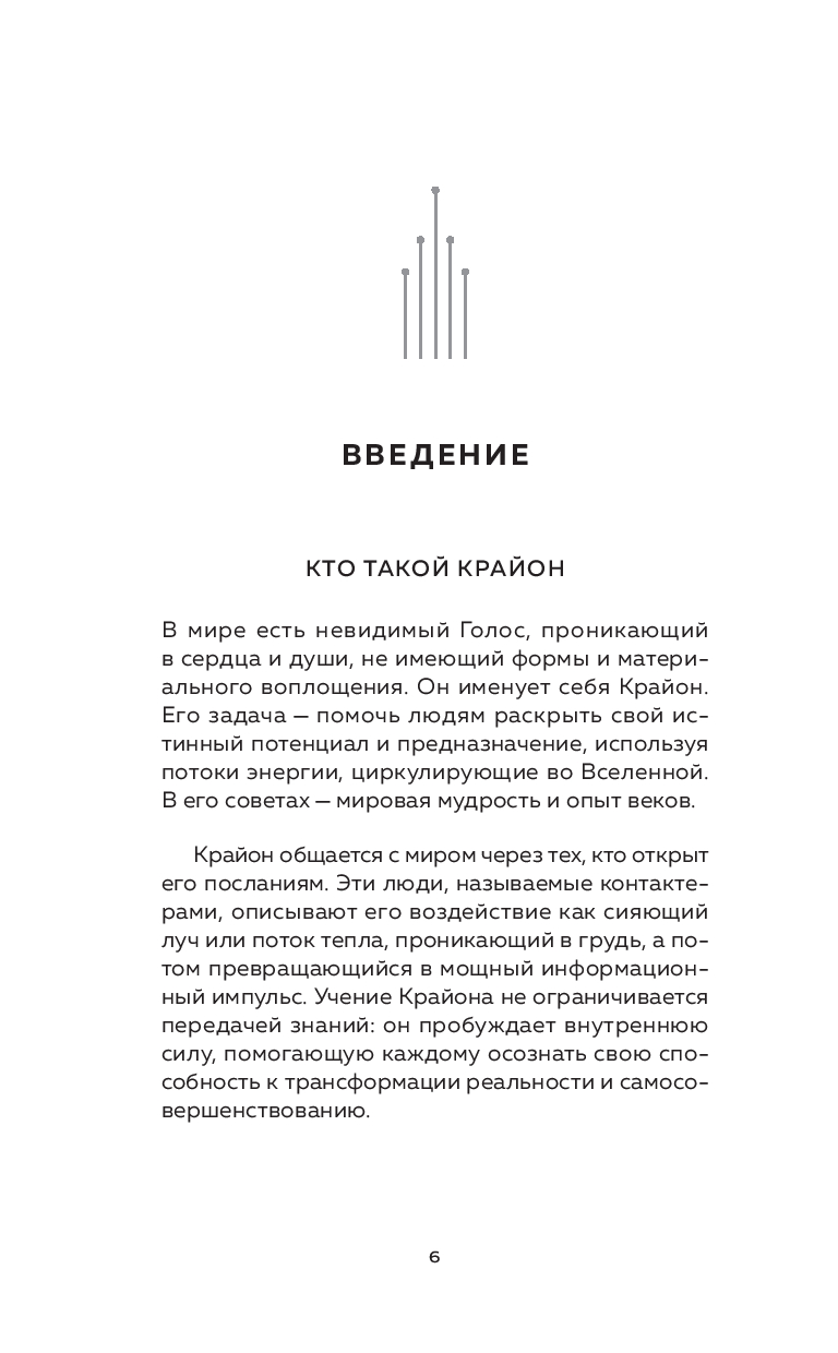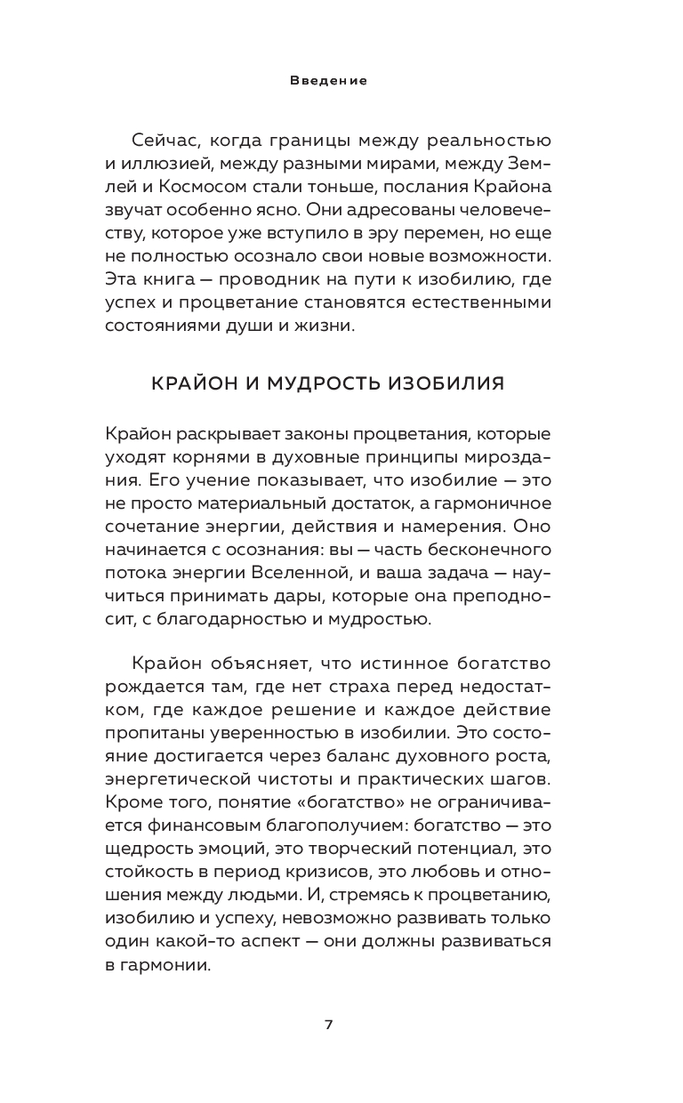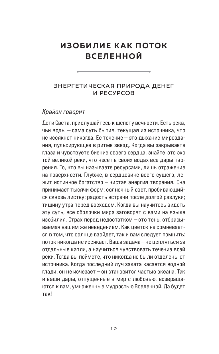 Есть Голос, свободный от формы, но узнаваемый сердцем. Он движется сквозь мерцание Божественного поля и именует себя Крайон. Его задача – незаметно исправлять энергетические потоки планеты и наполнять жизнь людей светом и мудростью. Эта книга посвящена теме финансового благополучия и изобилия, которые заключаются не только в материальных благах, но и в гармонии энергии, духовного роста и внутреннего состояния. Крайон напоминает, что каждый из нас способен жить в потоке процветания, если научится доверять Вселенной и своей внутренней силе. Чтобы это стало возможным, мы собрали в этой книге Послания Крайона с комментариями и пояснениями контактера Серафины Вейлан, посвящённые работе с энергией богатства и благополучия.