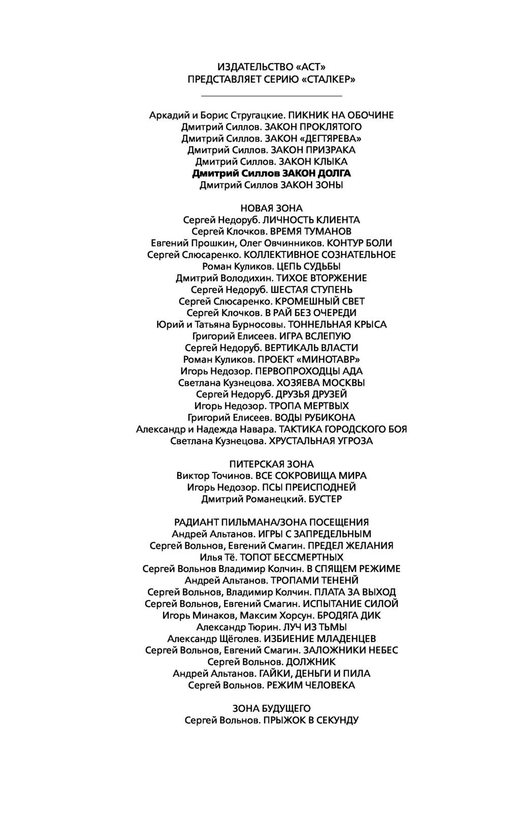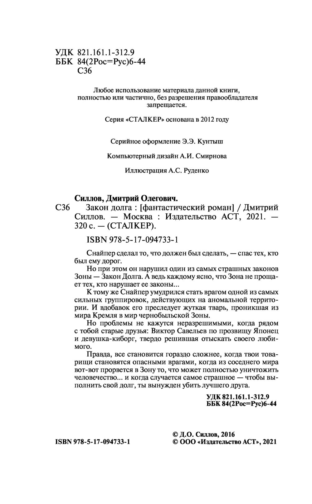 Снайпер сделал то, что должен был сделать – спас тех, кто был ему дорог. Но при этом он нарушил один из самых страшных законов Зоны – Закон Долга. А ведь каждому ясно, что Зона не прощает тех, кто нарушает ее законы... К тому же Снайпер умудрился стать врагом одной из самых сильных группировок, действующих на аномальной территории. И вдобавок его преследует жуткая тварь, проникшая из мира Кремля в мир чернобыльской Зоны.