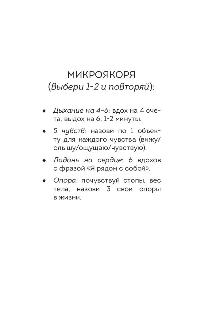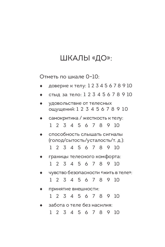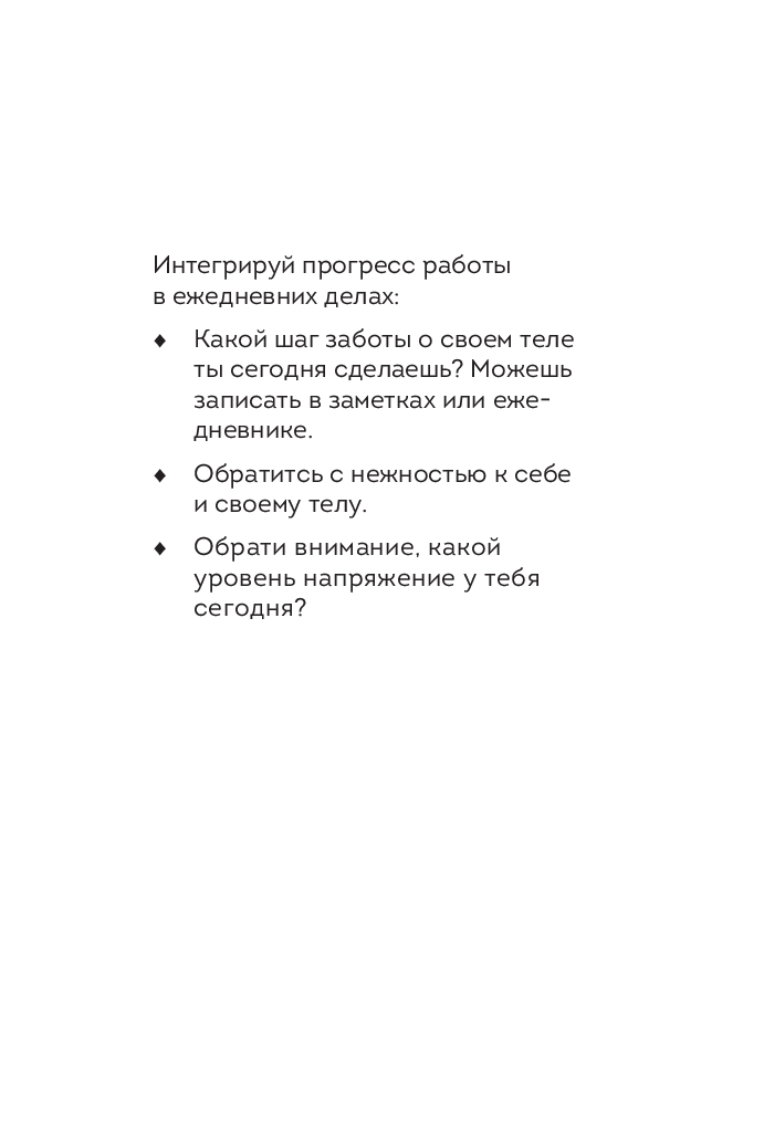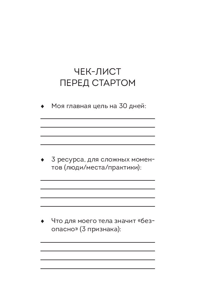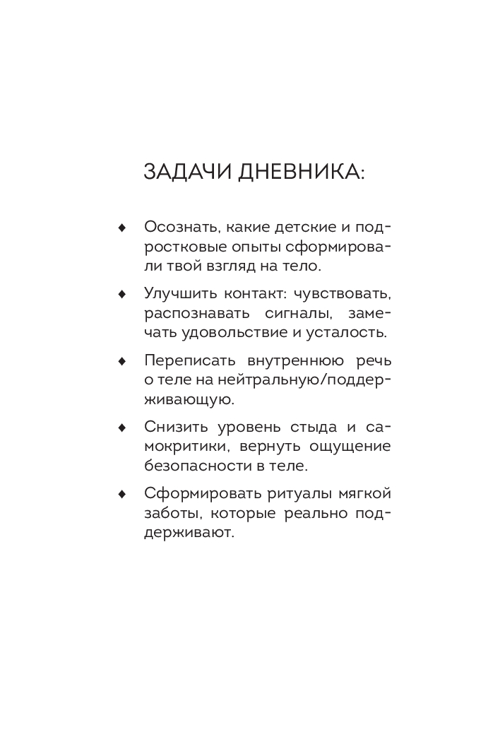 Тело – не проект. Это твой самый верный друг. А этот дневник – не про сантиметры, калории и "стандарты красоты". Он про союз с собой: слышать сигналы тела, уважать его границы, снижать стыд и внутреннюю критику, находить формы заботы, которые действительно поддерживают. Это 30 шагов от чужих голосов о твоем теле – к собственному голосу, который добрый, внимательный и уважительный.
