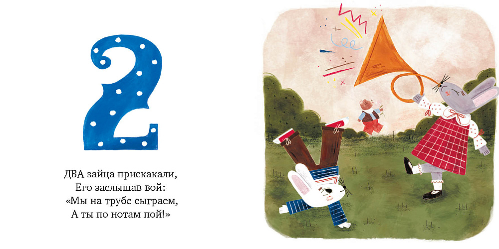 Однажды на лесной поляне запел медведь. Лес замер на мгновение, а потом к медведю присоединились зайцы, ёжики, лисички, лягушки и даже червяки. И получился прекрасный концерт. Это книжка – игра: вместе с ребёнком мы подпеваем животным и учимся считать.