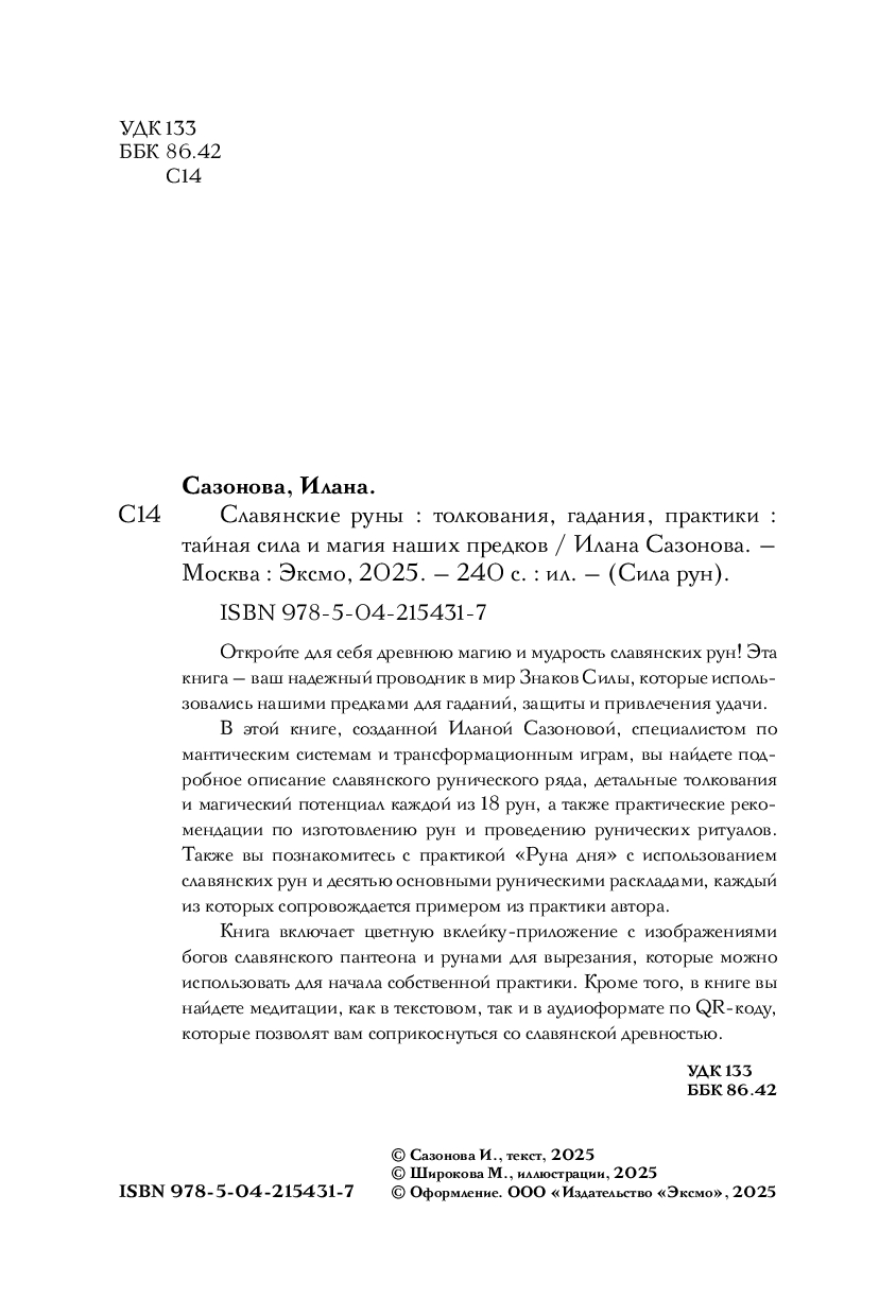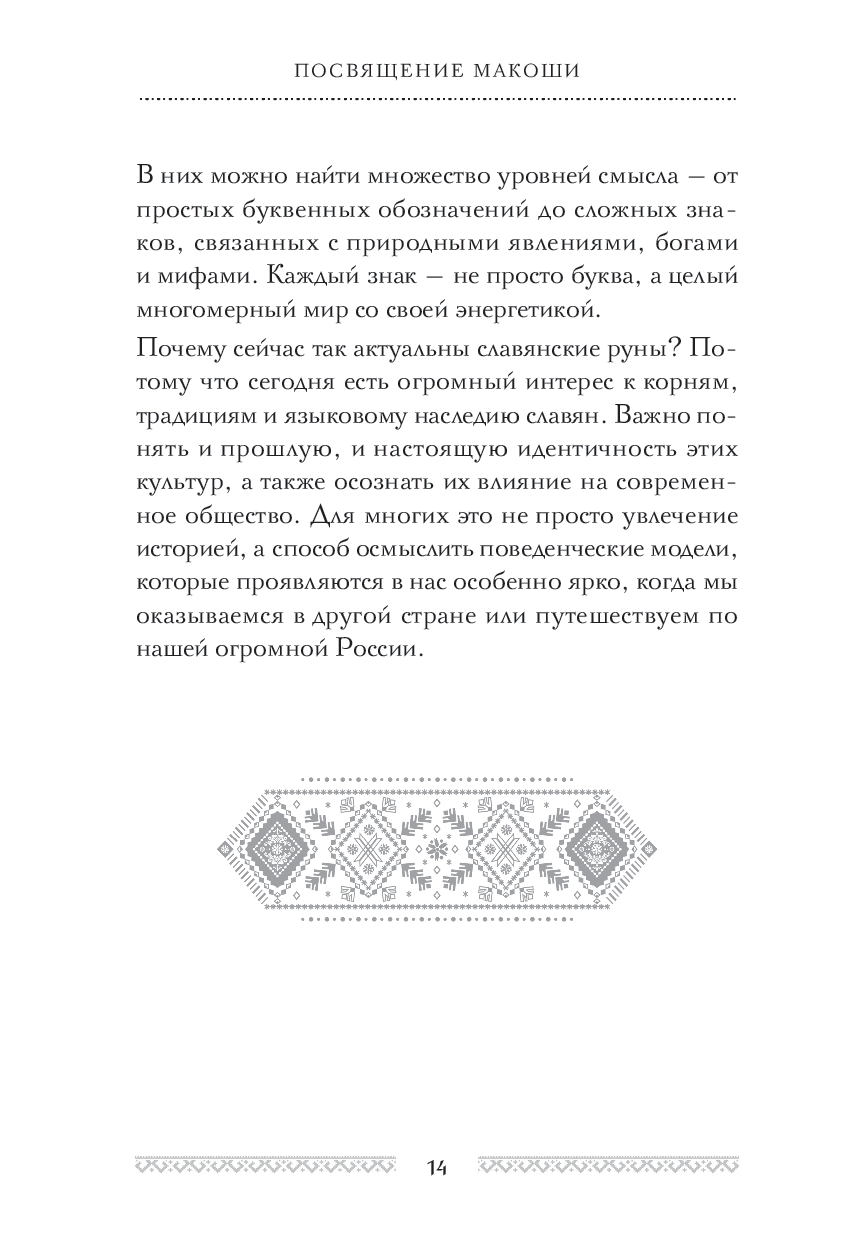 Книга включает цветную вклейку-приложение с изображениями богов славянского пантеона и рунами для вырезания, которые можно использовать для начала собственной практики. Кроме того, в книге вы найдете медитации, как в текстовом, так и в аудиоформате по QR-коду, которые позволят вам соприкоснуться со славянской древностью.