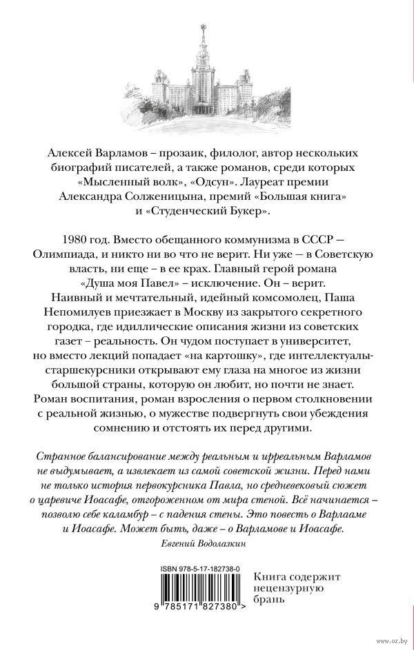 1980 год. Вместо обещанного коммунизма в СССР – Олимпиада, и никто ни во что не верит. Ни в Советскую власть, ни в ее крах. Главный герой романа “Душа моя Павел” – исключение. Наивный и мечтательный, идейный комсомолец, Паша Непомилуев приезжает в Москву из закрытого секретного городка, где идиллические описания жизни из советских газет – реальность. Он чудом поступает в университет, но вместо лекций попадает “на картошку”, где интеллектуалы-старшекурсники открывают ему глаза на многое из жизни большой страны, которую он любит, но почти не знает.