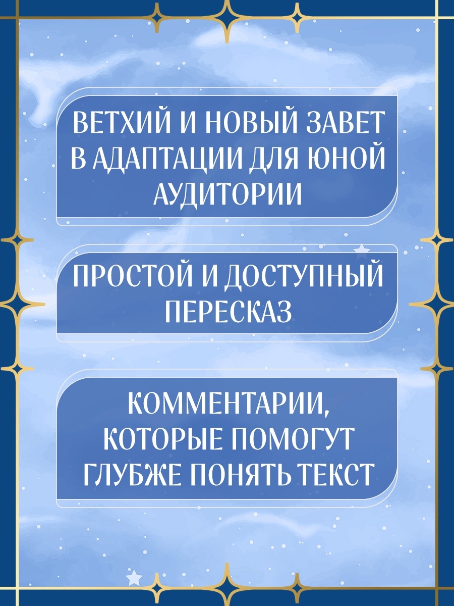 Это издание, адаптированное для юных читателей, простым и доступным языком пересказывает события Ветхого и Нового Завета: от сотворения мира и появления Адама и Евы до воскресения Иисуса Христа и Страшного суда. Исторические справки и пояснительные комментарии помогают глубже понять библейский текст и культурный контекст, а благодаря красочным иллюстрациям и фотографиям священные истории обретают яркие образы.