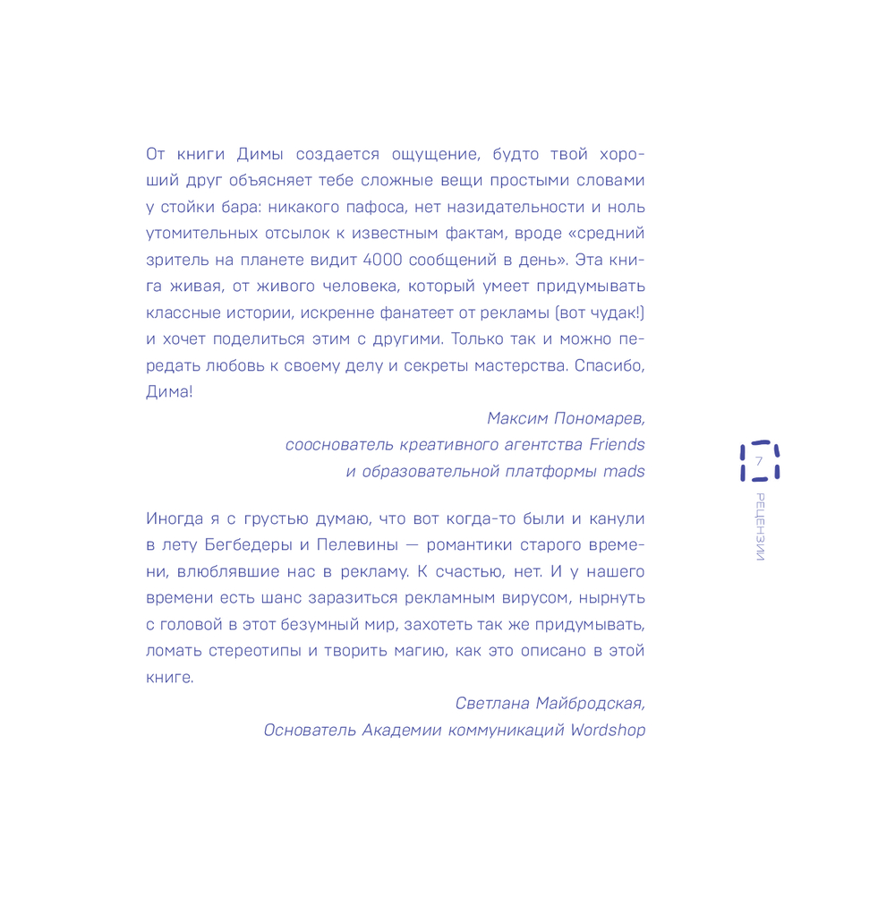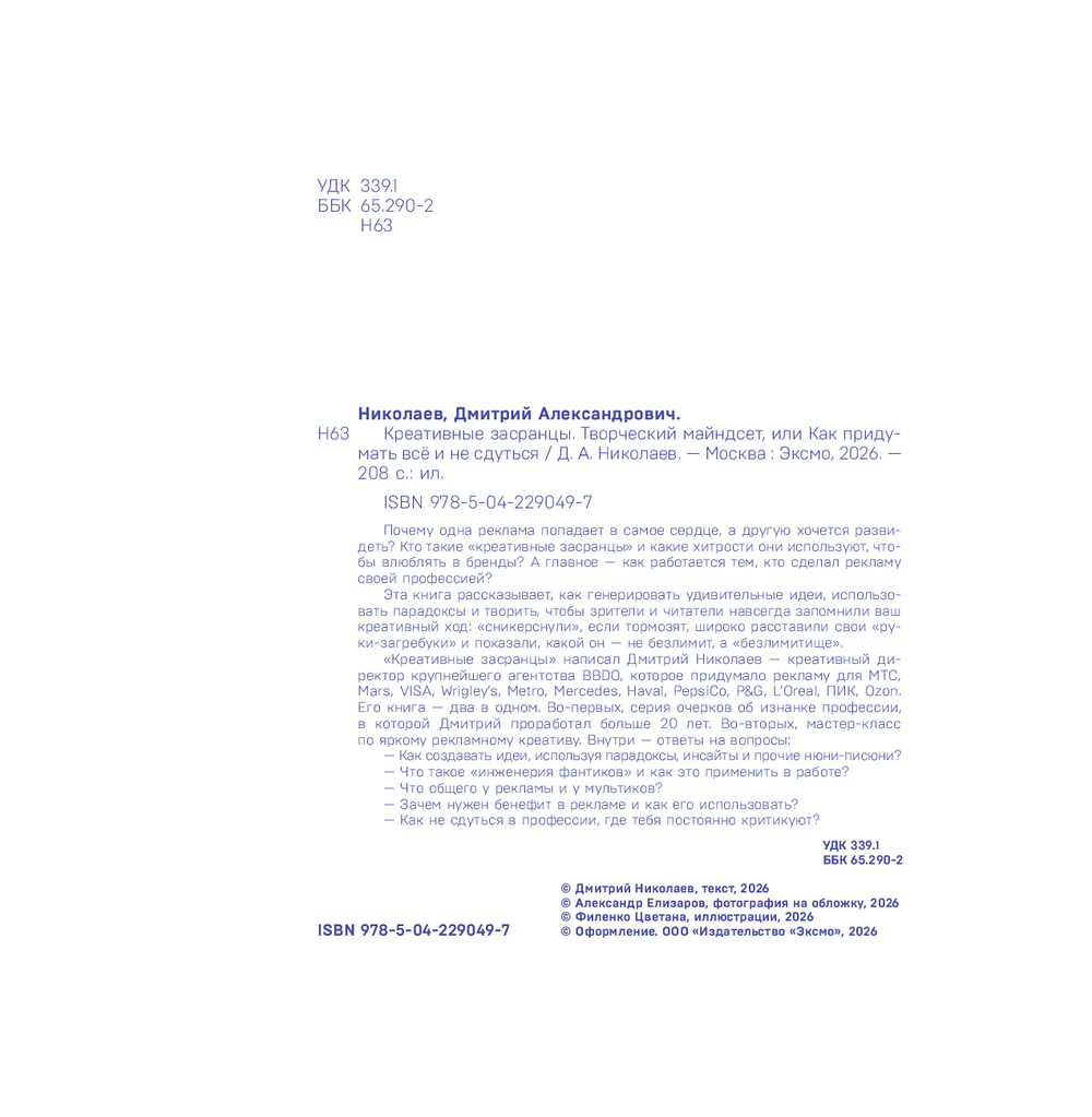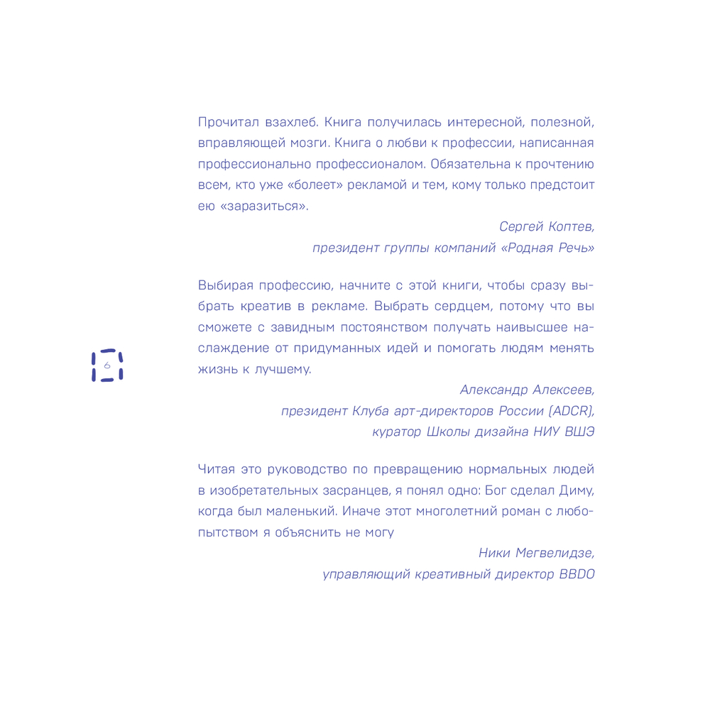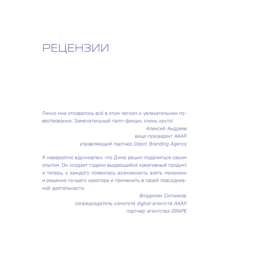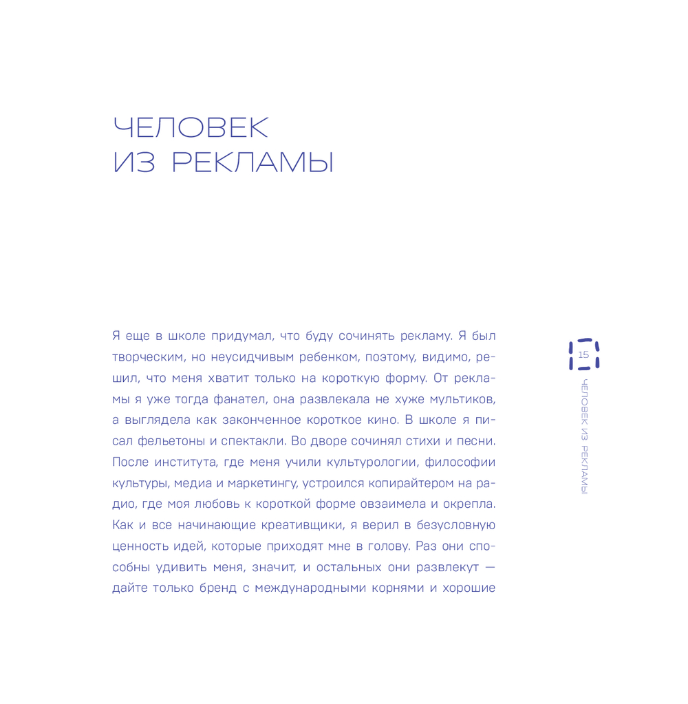 "Креативные засранцы" написал Дмитрий Николаев – креативный директор крупнейшего агентства BBDO, которое придумало рекламу для МТС, Mars, VISA, Wrigley's, Metro, Mercedes, Haval, PepsiCo, P&G, L'Oreal, ПИК, Ozon. Его книга – два в одном. Во-первых, серия очерков об изнанке профессии, в которой Дмитрий проработал больше 20-ти лет. Во-вторых, мастер-класс по яркому рекламному креативу. Внутри – ответы на вопросы: