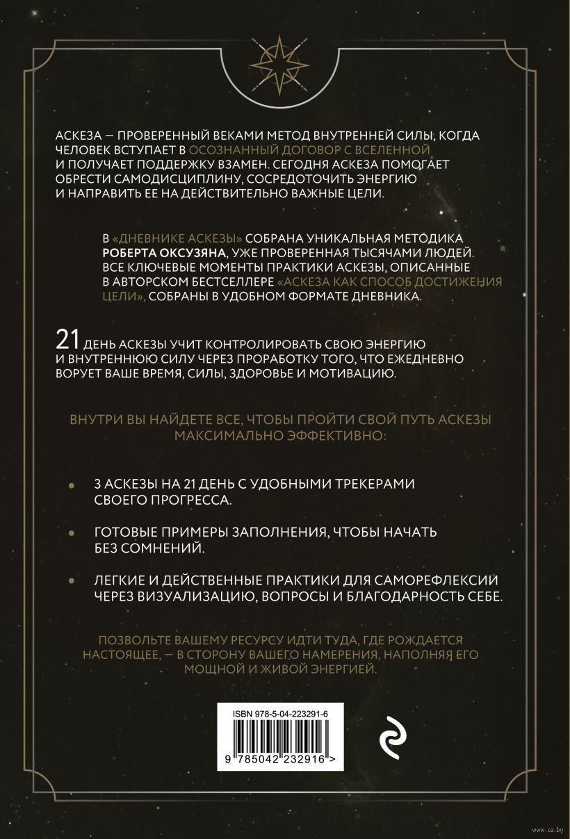 "Дневник Аскезы" – это простой пошаговый путеводитель, созданный не только для самодисциплины, но также для глубокой внутренней трансформации и укрепления духа. Дневник построен на древней практике Аскезы, но с современным подходом. Это уникальная методика автора бестселлера "Аскеза как способ достижения цели" Роберта Оксузяна, уже проверенная тысячами людей.