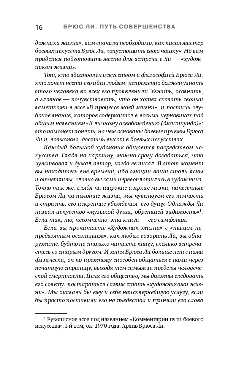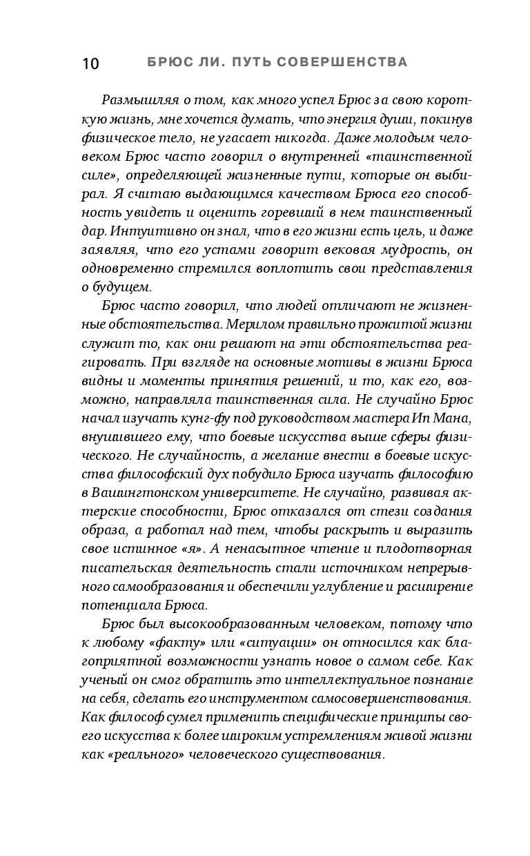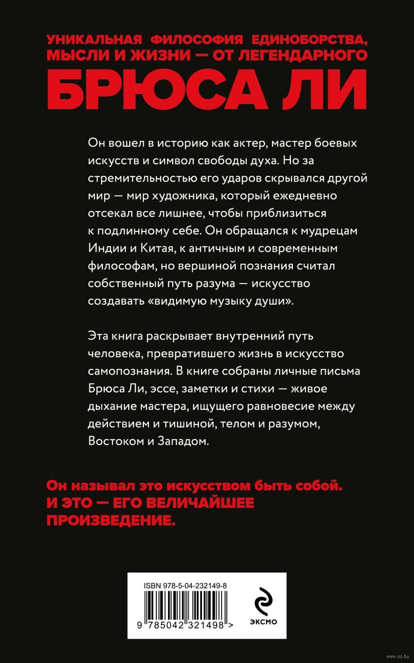 Произведением искусства стала и его жизнь, отраженная в этих мемуарах – собрании автобиографических заметок, писем, эссе и стихов разных лет. На этих страницах Брюс Ли предстает как поэт и мыслитель, муж и отец, для которого жизнь стала величайшим из искусств.