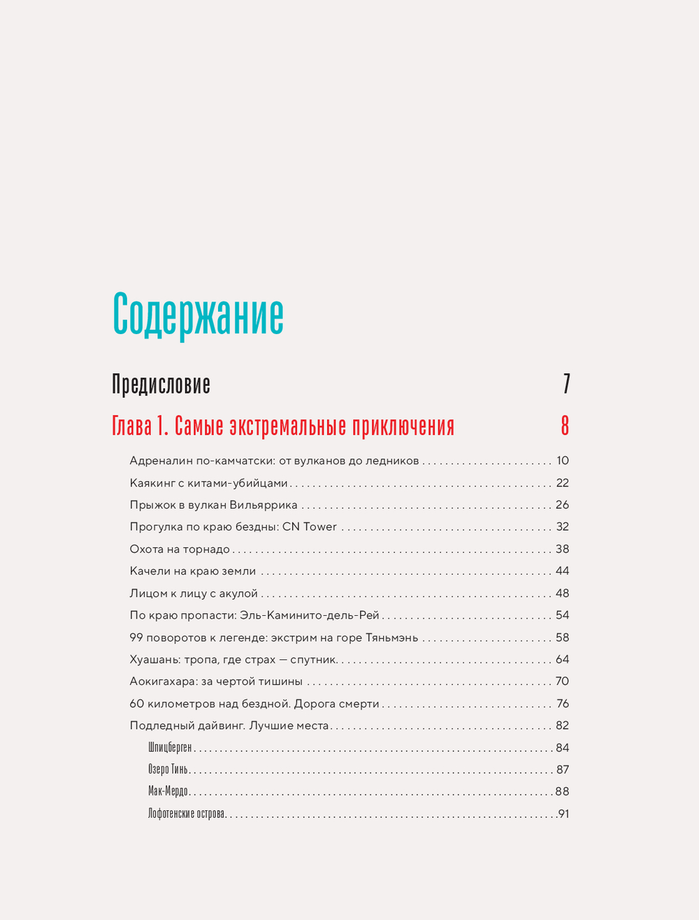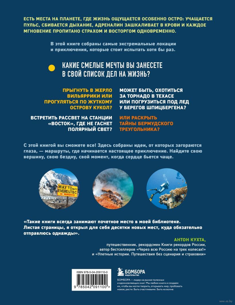 На ее страницах собраны уникальные истории и потрясающие фотографии: от вулканов Камчатки и заснеженных вершин Эвереста до мистической Долины смерти, ледяных пещер, островов-призраков и самых диких уголков океана. Вы окажетесь на "качелях на краю света" в Эквадоре, шагнете к самому кратеру Вильяррики в Чили, пройдете по карнизу CN Tower в Канаде и узнаете, каково встретиться лицом к лицу с акулой или диким племенем.