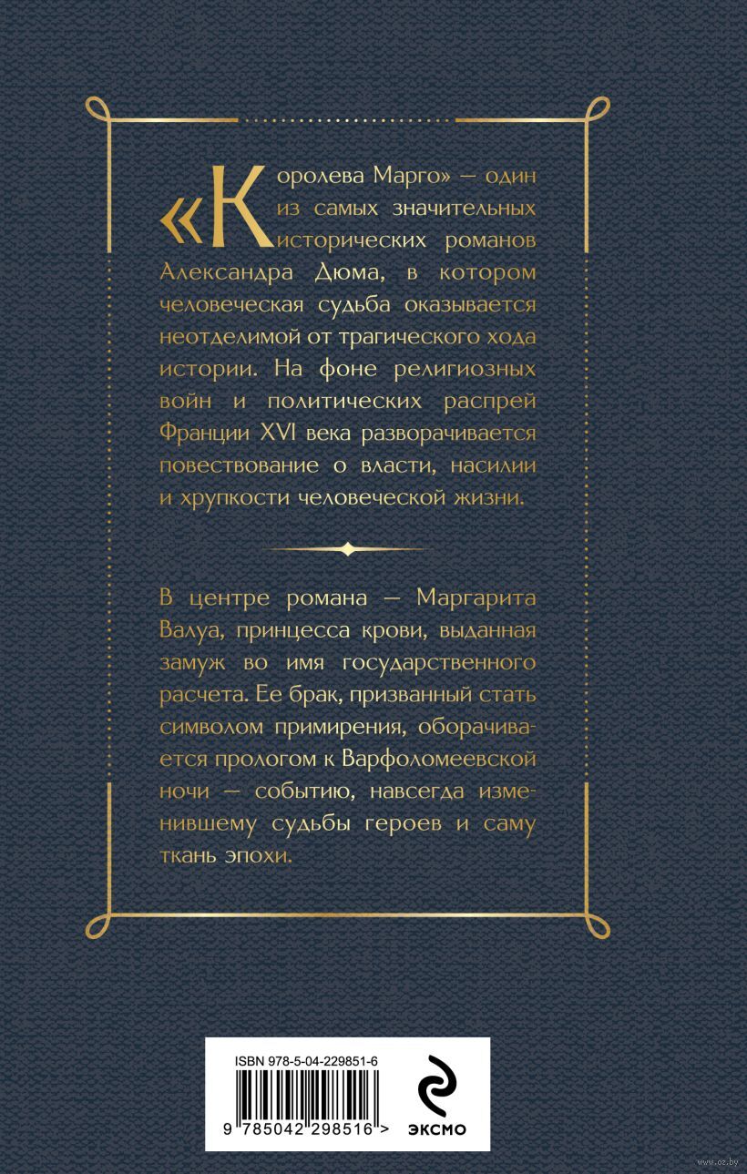 "Королева Марго" – один из самых значительных исторических романов Александра Дюма, в котором человеческая судьба оказывается неотделимой от трагического хода истории.