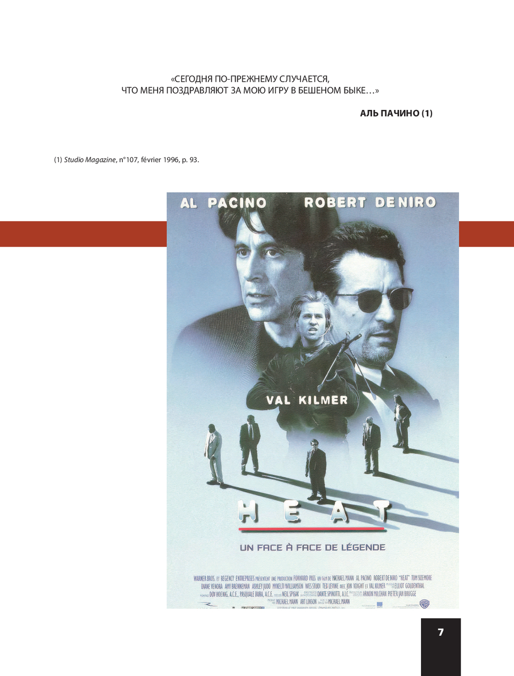 Будь то мафиози или полицейские, они – жертвы городской отчуждённости, насилия и коррупции. Их персонажи колеблются между одиночеством и выживанием, крепкой дружбой и невыполнимыми задачами. Герои Де Ниро и Пачино стали отражением окончания двадцатого столетия.