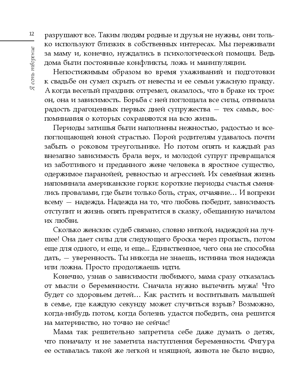 "Я есть творение" – вдохновляющая автобиография о становлении, любви к жизни и верности своему предназначению. Это откровенный разговор о хрупкости, превращающейся в мощь; о пути к себе и к свободе быть настоящей. Каждая страница – шаг к осознанию: мы не заложники прошлого, а творцы своей судьбы.