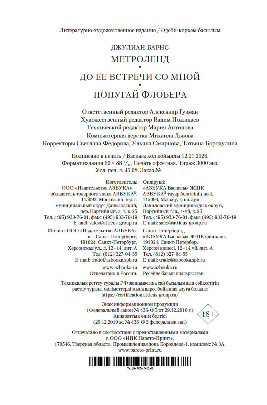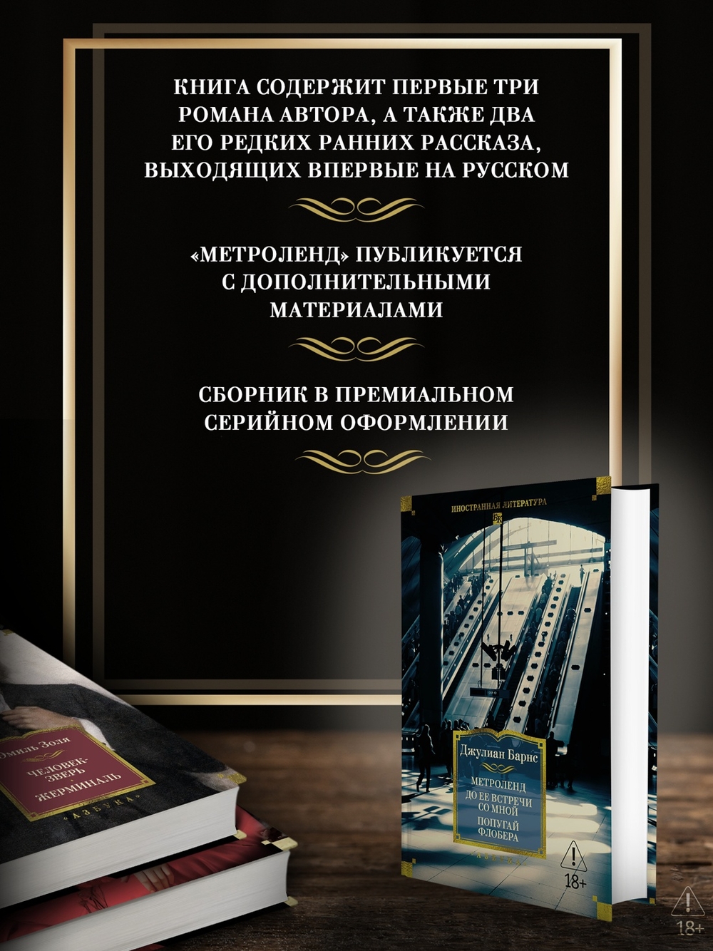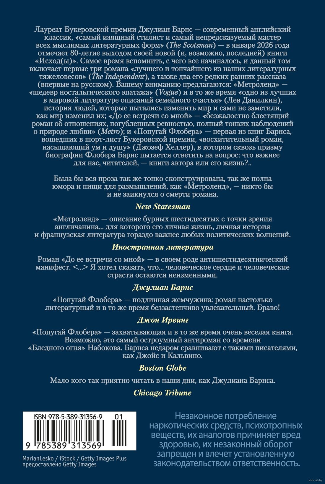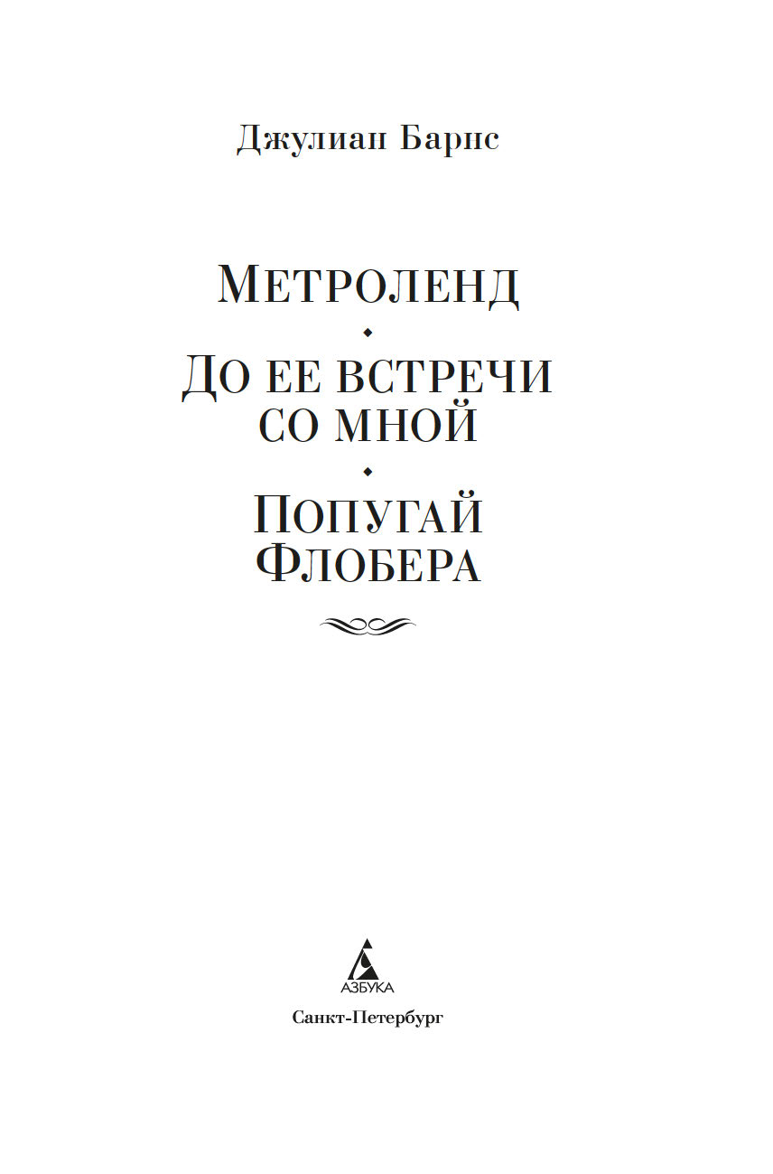Вашему вниманию предлагаются: "Метроленд" – "шедевр ностальгического эпатажа" (Vogue) и в то же время "одно из лучших в мировой литературе описаний семейного счастья" (Лев Данилкин), история людей, которые пытались изменить мир и сами не заметили, как мир изменил их (роман публикуется с дополнительными материалами – предисловие к юбилейному изданию, удаленная сцена); "До ее встречи со мной" – "безжалостно блестящий роман об отношениях, погубленных ревностью, полный тонких наблюдений о природе любви" (Metro); и "Попугай Флобера" – первая из книг Барнса, вошедших в шорт-лист Букеровской премии, "восхитительный роман, насыщающий ум и душу" (Джозеф Хеллер), в котором сквозь призму биографии Флобера Барнс пытается ответить на вопрос: что важнее для нас, читателей, – книги автора или его жизнь?..