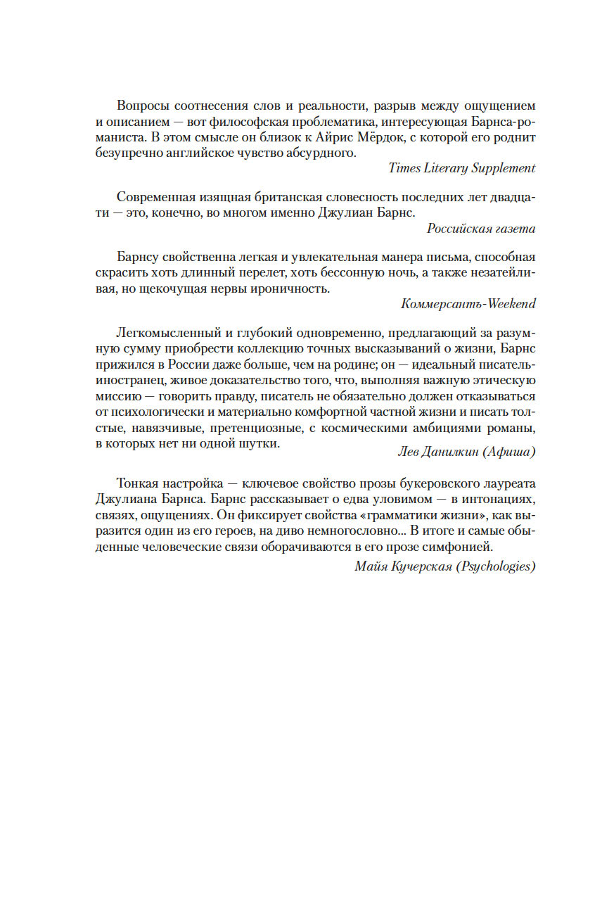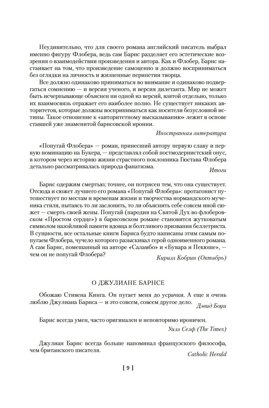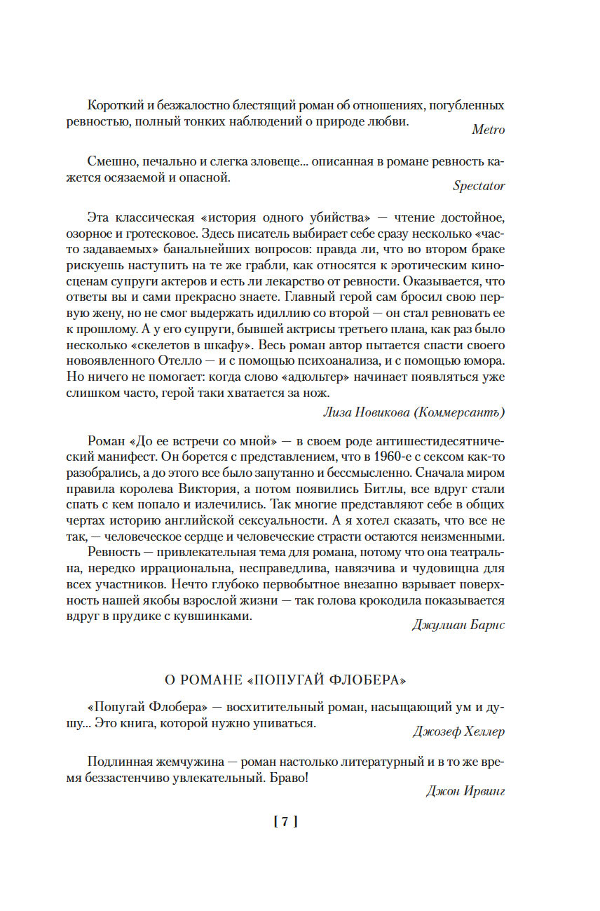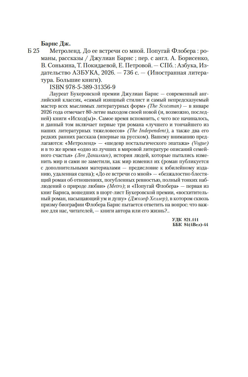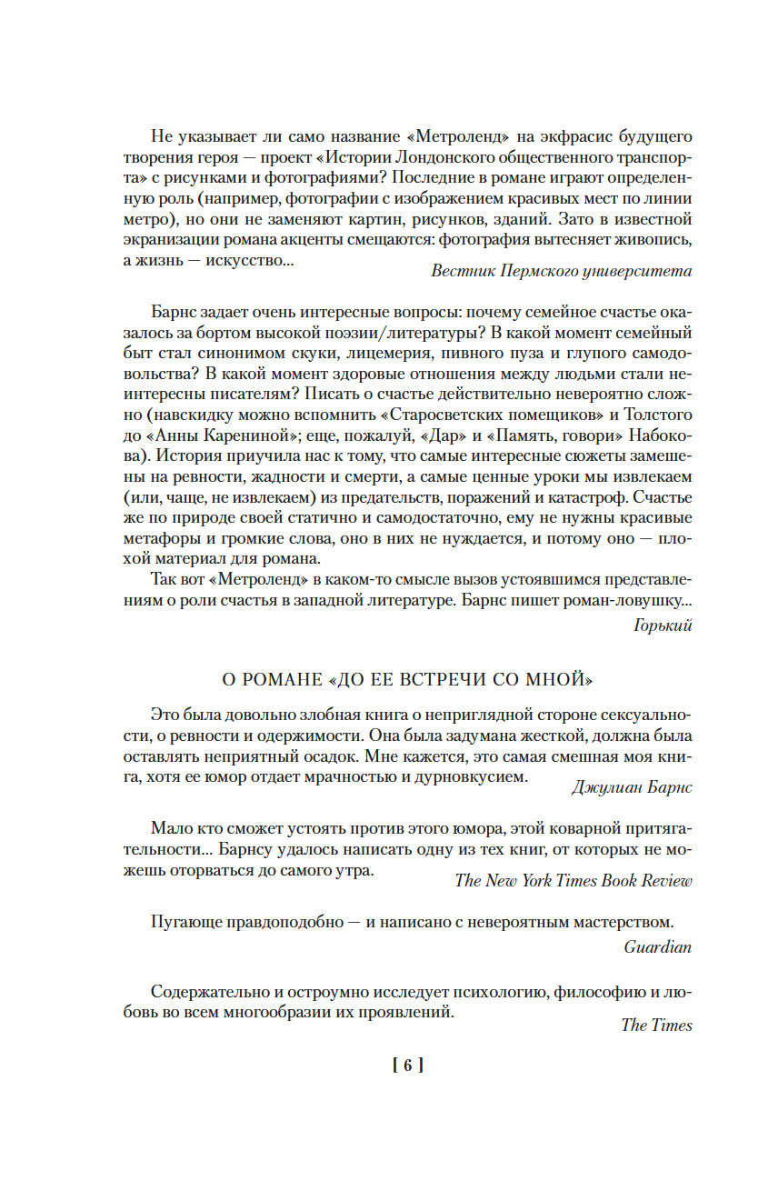 Вашему вниманию предлагаются: "Метроленд" – "шедевр ностальгического эпатажа" (Vogue) и в то же время "одно из лучших в мировой литературе описаний семейного счастья" (Лев Данилкин), история людей, которые пытались изменить мир и сами не заметили, как мир изменил их (роман публикуется с дополнительными материалами – предисловие к юбилейному изданию, удаленная сцена); "До ее встречи со мной" – "безжалостно блестящий роман об отношениях, погубленных ревностью, полный тонких наблюдений о природе любви" (Metro); и "Попугай Флобера" – первая из книг Барнса, вошедших в шорт-лист Букеровской премии, "восхитительный роман, насыщающий ум и душу" (Джозеф Хеллер), в котором сквозь призму биографии Флобера Барнс пытается ответить на вопрос: что важнее для нас, читателей, – книги автора или его жизнь?..