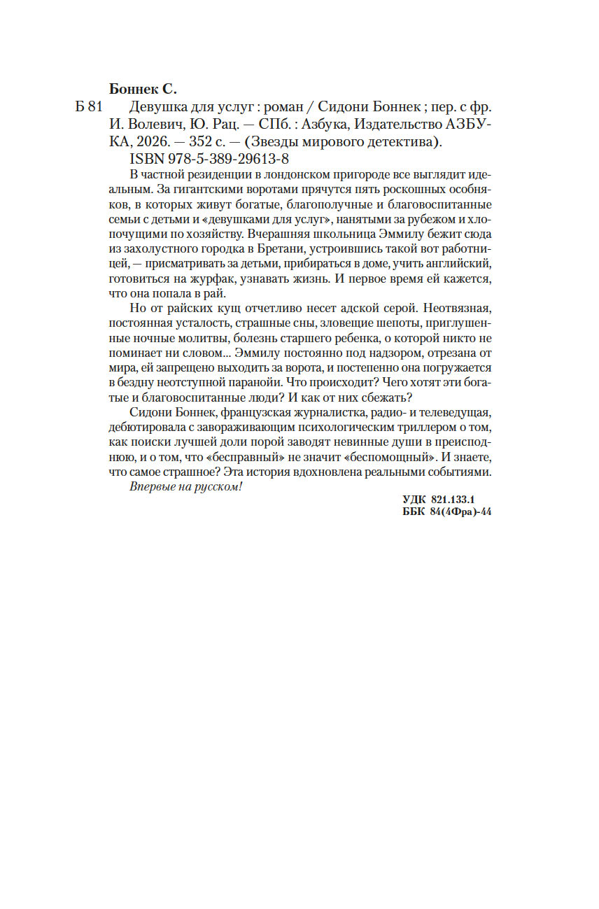 Сидони Боннек, французская журналистка, радио- и телеведущая, дебютировала с завораживающим психологическим триллером о том, как поиски лучшей доли порой заводят невинные души в преисподнюю, и о том, что "бесправный" не значит "беспомощный". И знаете, что самое страшное? Эта история вдохновлена реальными событиями.