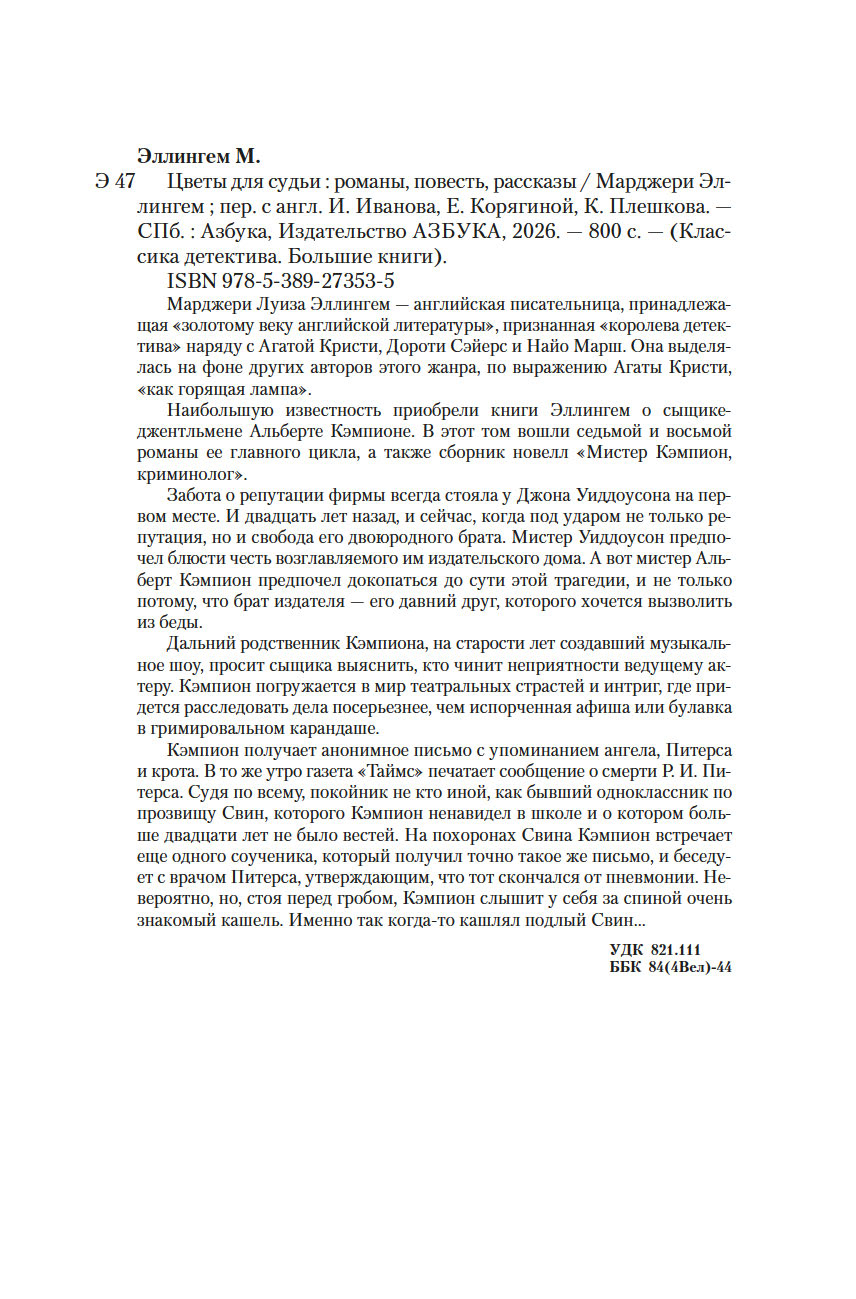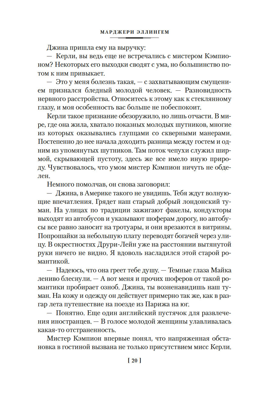 Наибольшую известность приобрели книги Эллингем о сыщике-джентльмене Альберте Кэмпионе. В этот том вошли седьмой и восьмой романы ее главного цикла, а также сборник новелл "Мистер Кэмпион, криминолог".