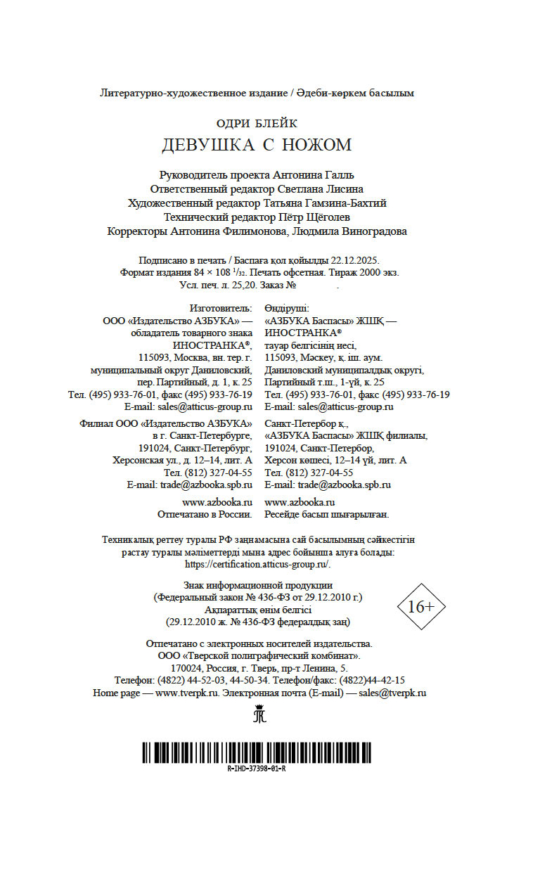 | Изготовитель | ООО "Издательство "Иностранка". 109017, РФ, г. Москва, ул. Пятницкая, 41 |