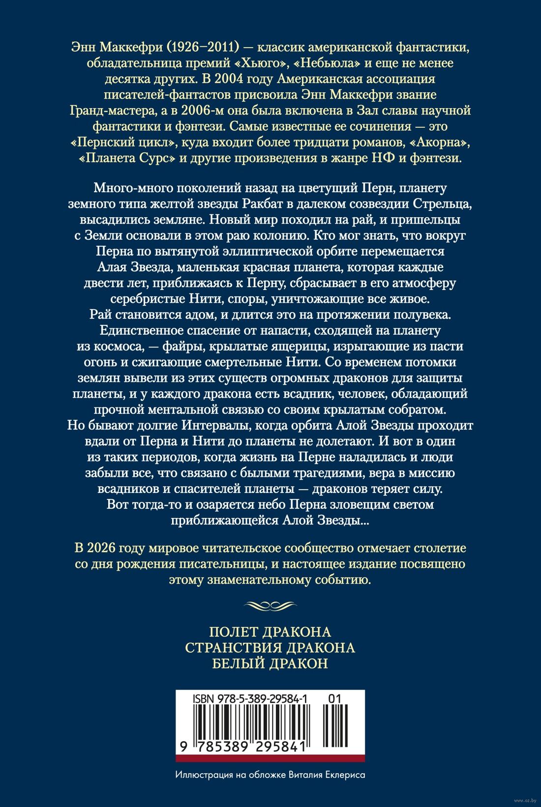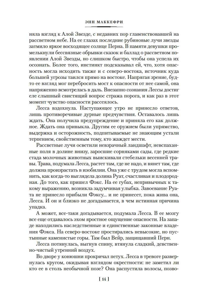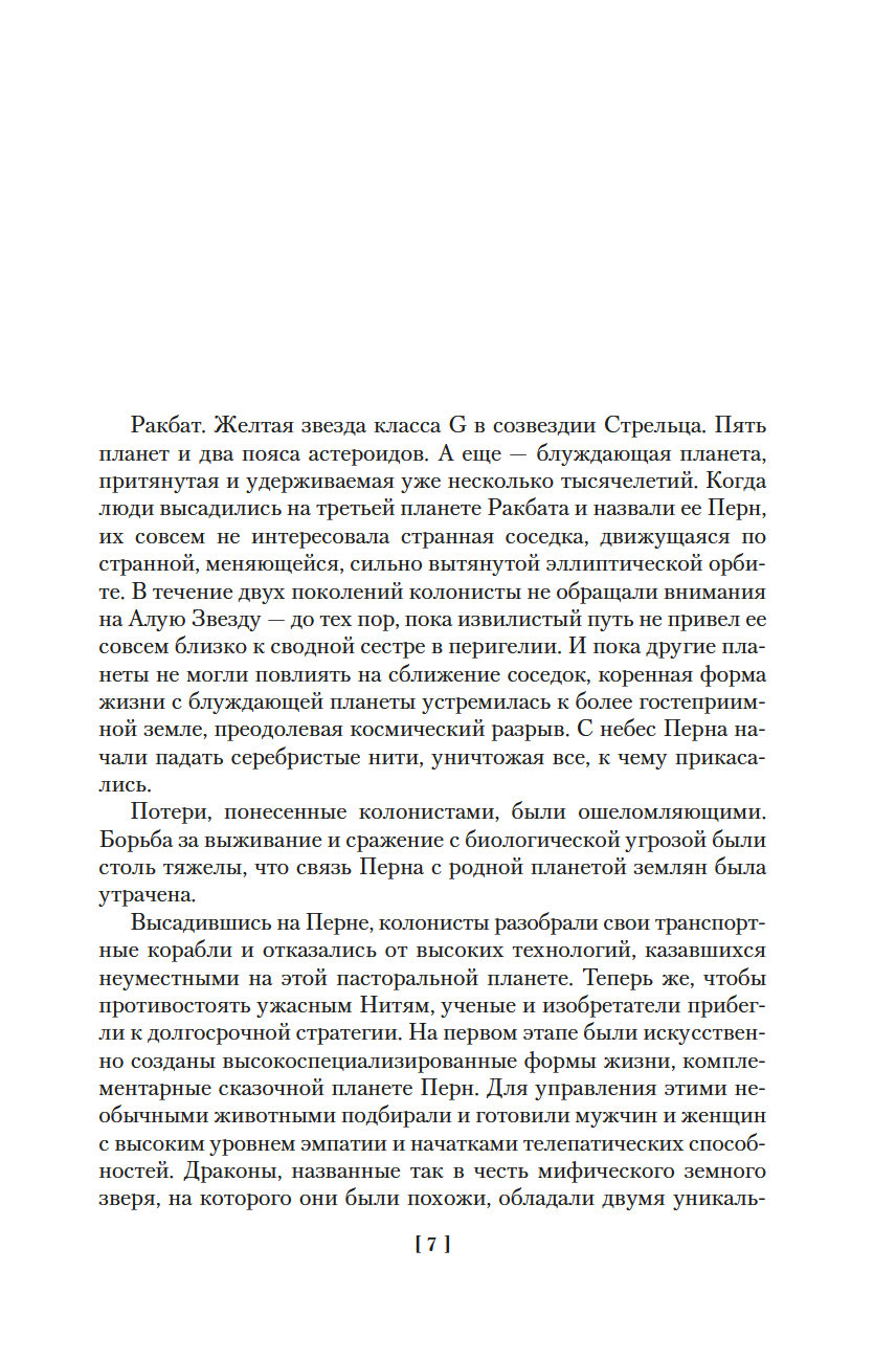 Много-много поколений назад на цветущий Перн, планету земного типа желтой звезды Ракбат в далеком созвездии Стрельца, высадились земляне. Новый мир походил на рай, и пришельцы с Земли основали в этом раю колонию. Кто мог знать, что вокруг Перна по вытянутой эллиптической орбите перемещается Алая Звезда, маленькая красная планета, которая каждые двести лет, приближаясь к Перну, сбрасывает в его атмосферу серебристые Нити – споры, уничтожающие все живое. Рай становится адом, и длится это на протяжении полувека. Единственное спасение от напасти, сходящей на планету из космоса, – файры, крылатые ящерицы, изрыгающие из пасти огонь и сжигающие смертельные Нити. Со временем потомки землян вывели из этих существ огромных драконов для защиты планеты, и у каждого дракона есть всадник, человек, обладающий прочной ментальной связью со своим крылатым собратом. Но бывают долгие Интервалы, когда орбита Алой Звезды проходит вдали от Перна и Нити до планеты не долетают. И вот в один из таких периодов, когда жизнь на Перне наладилась и люди забыли все, что связано с былыми трагедиями, вера в миссию всадников и спасителей планеты – драконов теряет силу. Вот тогда-то и озаряется небо Перна зловещим светом приближающейся Алой Звезды…