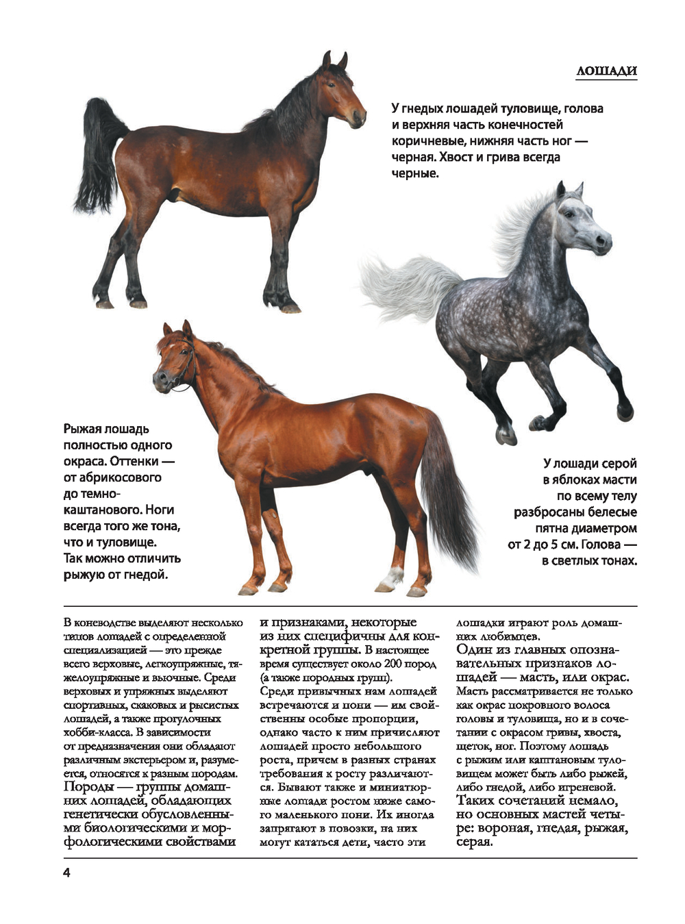 Данное издание поможет вам получить ответ на этот и многие другие вопросы, связанные со специализацией лошадей, разнообразием их типов и групп, особенностями мастей и аллюров, нрава и темперамента, а также скаковыми и рабочими качествами. А на сотнях зрелищных фотографий вы сможете рассмотреть в эффектных ракурсах неукротимых мустангов, быстроногих ахалтекинцев, послушных андалузов, добронравных лузитано, огромных першеронов, выносливых шагия-арабов, нарядных орловских рысаков и представителей многих других пород.