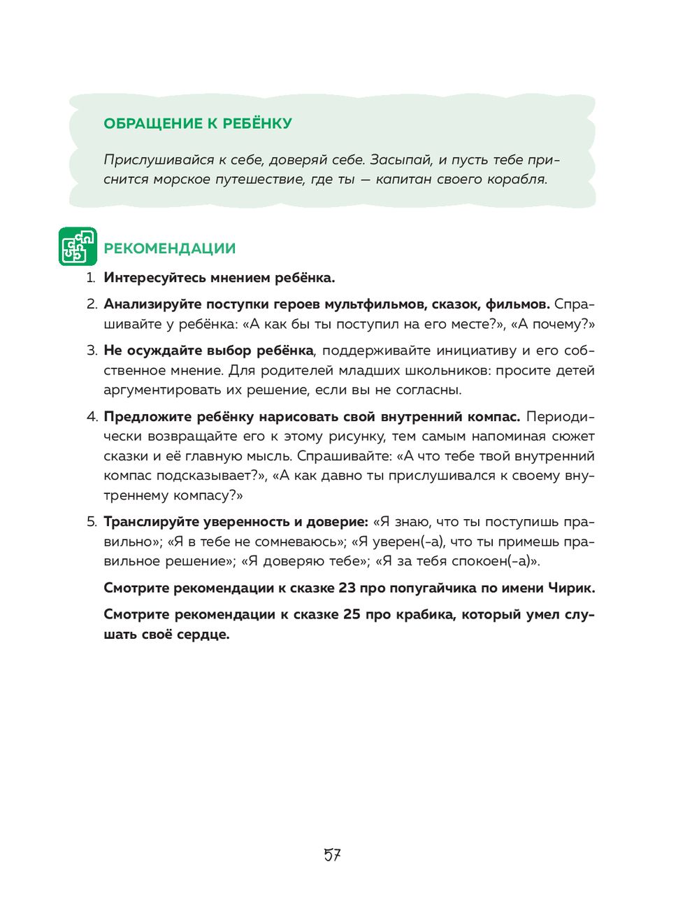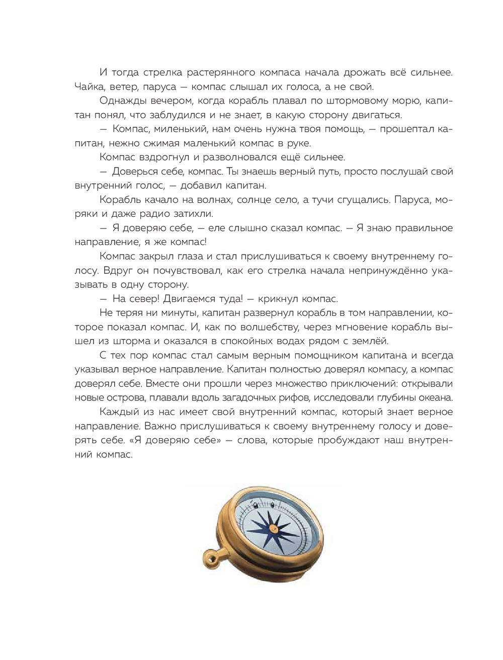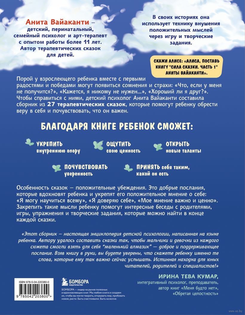 Порой у взрослеющего ребенка вместе с первыми радостями и победами могут появляться сомнения и страхи: "Что, если у меня не получится?", "Кажется, я никому не нужен…", "Хороший ли я друг?". Чтобы помочь с ними справиться, детский, перинатальный и семейный психолог Анита Вайаканти создала сборник из 27 сказок, в каждую из которых она вложила положительные убеждения. Это теплые фразы, которые помогут ребенку обрести уверенность и почувствовать свою ценность: "Я могу научиться всему", "Я доверяю себе", "Мое мнение важно и ценно".