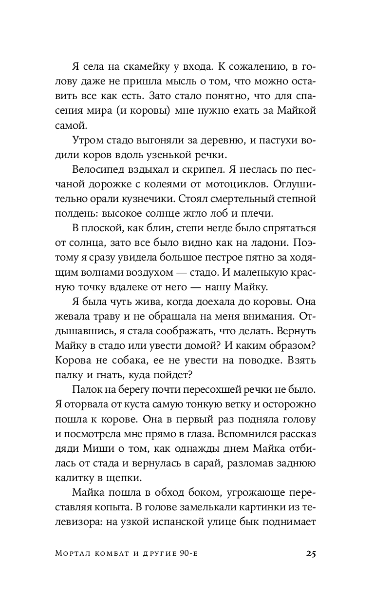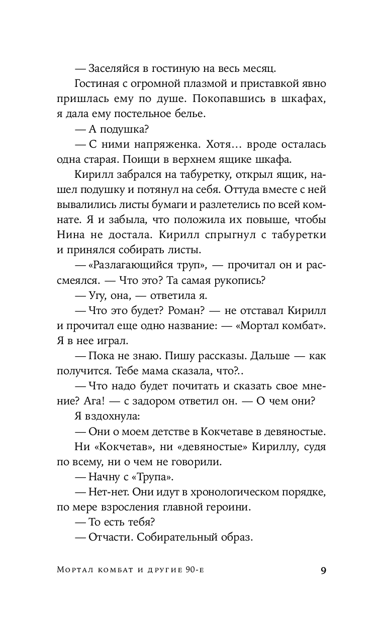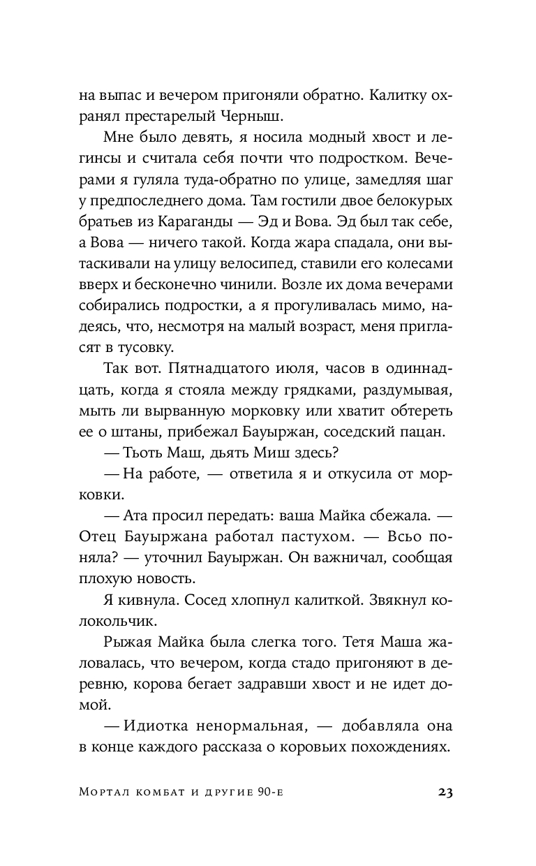 Сборник "Мортал комбат и другие 90-е" рассказывает о детстве в девяностые годы в Казахстане. Каждый сюжет – небольшая история взросления. Первые детские впечатления – погоня за коровой в деревне, ночное путешествие в плацкарте, страстное коллекционирование вкладышей – постепенно сменяются историями о подростковых переживаниях: влюбленностях, буллинге, дружбе, отношениях с родителями и с родным городом.